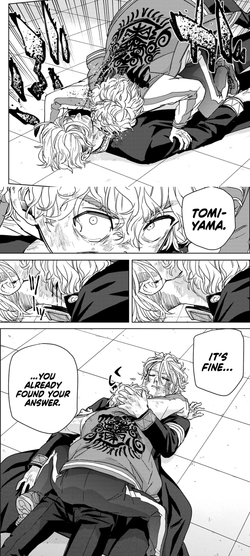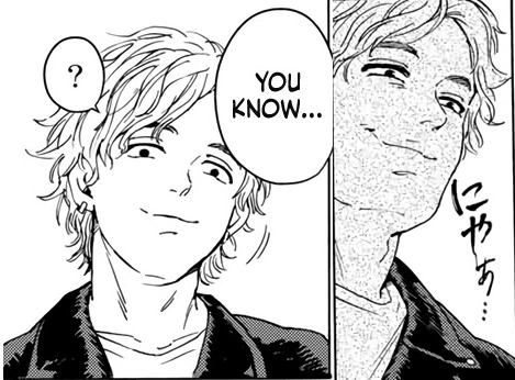 So, Sako called out Hiragi for a fight back in chapter 7. Shows the two have history, right? Well, once their fight starts, we get that history within the same chapter that Sako loses the fight. Super fast, okay, but still no biggie. But it set a precedent for the two following fights: Fights starts>Lore for why the SST char is the way they are >SST member loses and has understanding beaten into them. As such, when all the fights are over, it's 5-0 in favor of Bofuurin, and Togame and Tomiyama now don't wanna be asshole leaders that focus on strength over all in place of caring for their members. Sako, Kanuma, and Arima don't get much screentime during this but I imagine they're probably in the same boat, too. Redemption for them isn't horrible but the issue is that they have hardly had any time to be antags and make it hit harder that they're now chill. To put it into perspective,