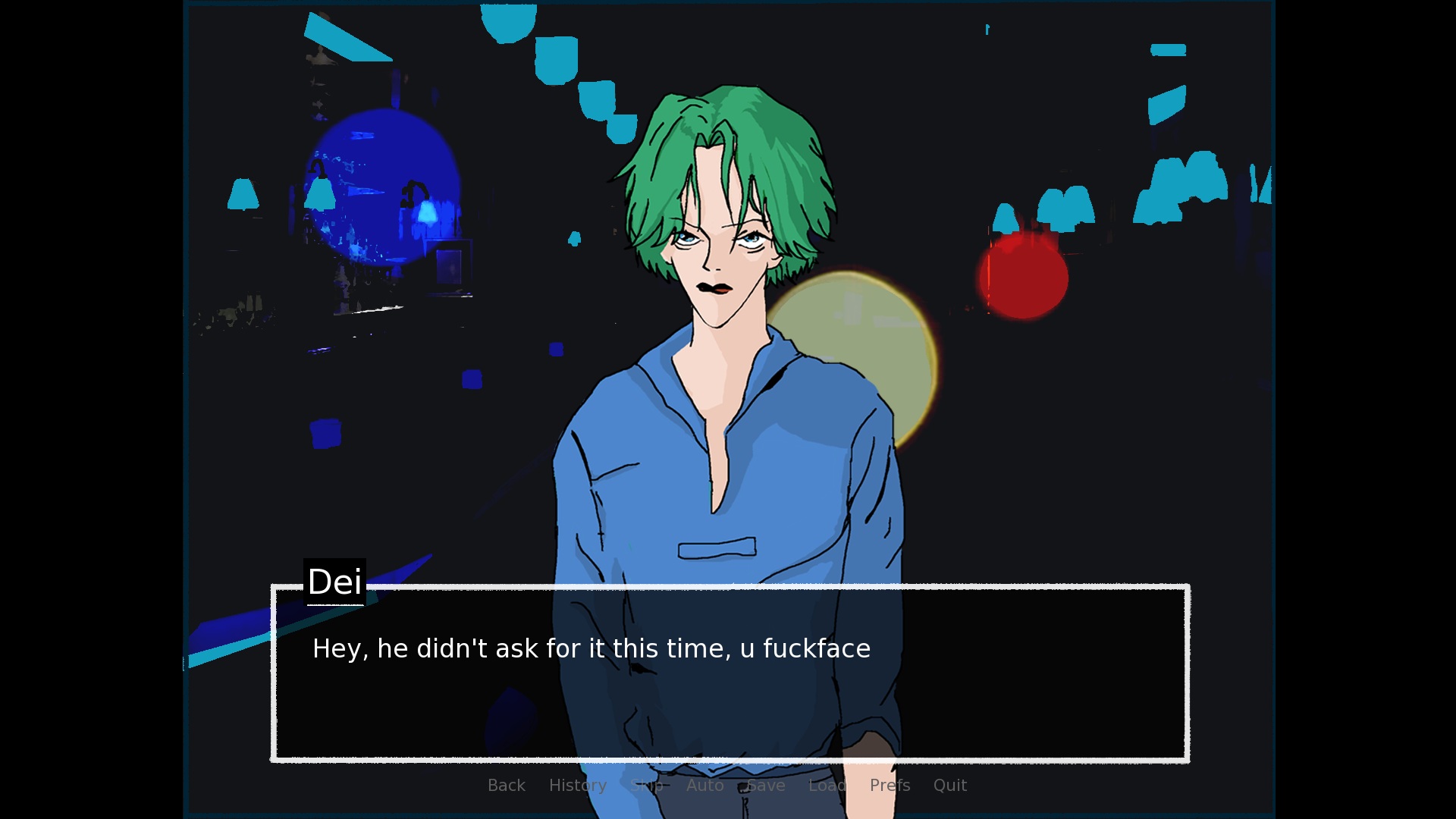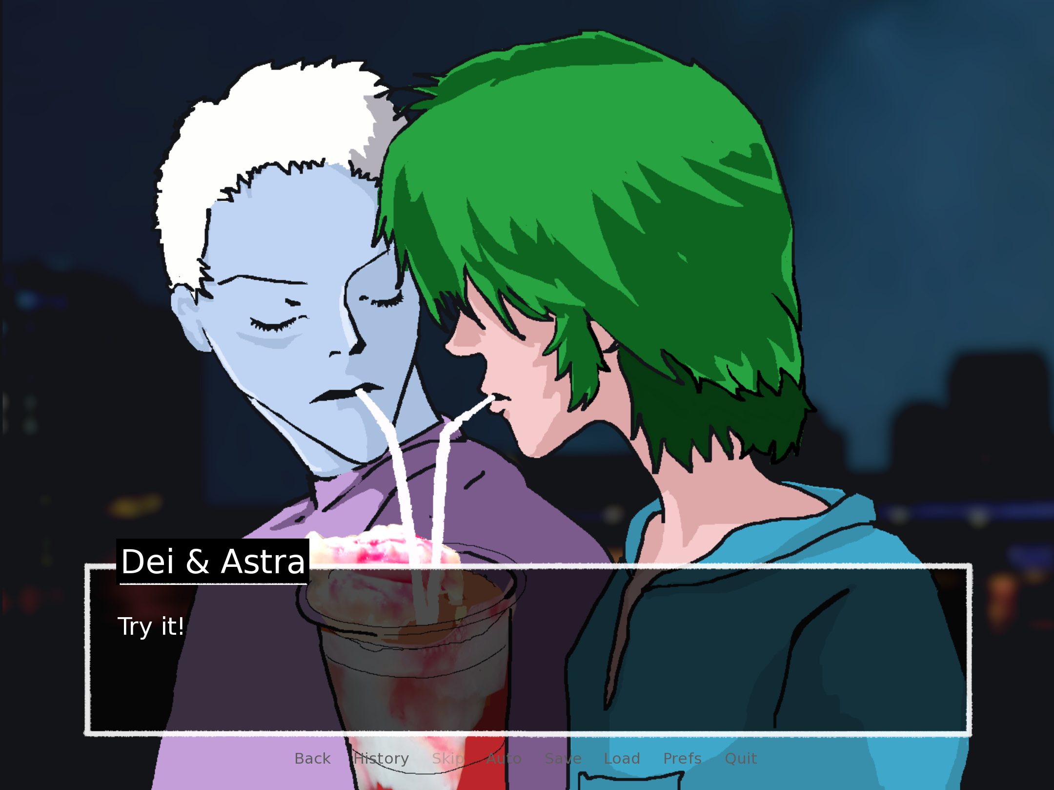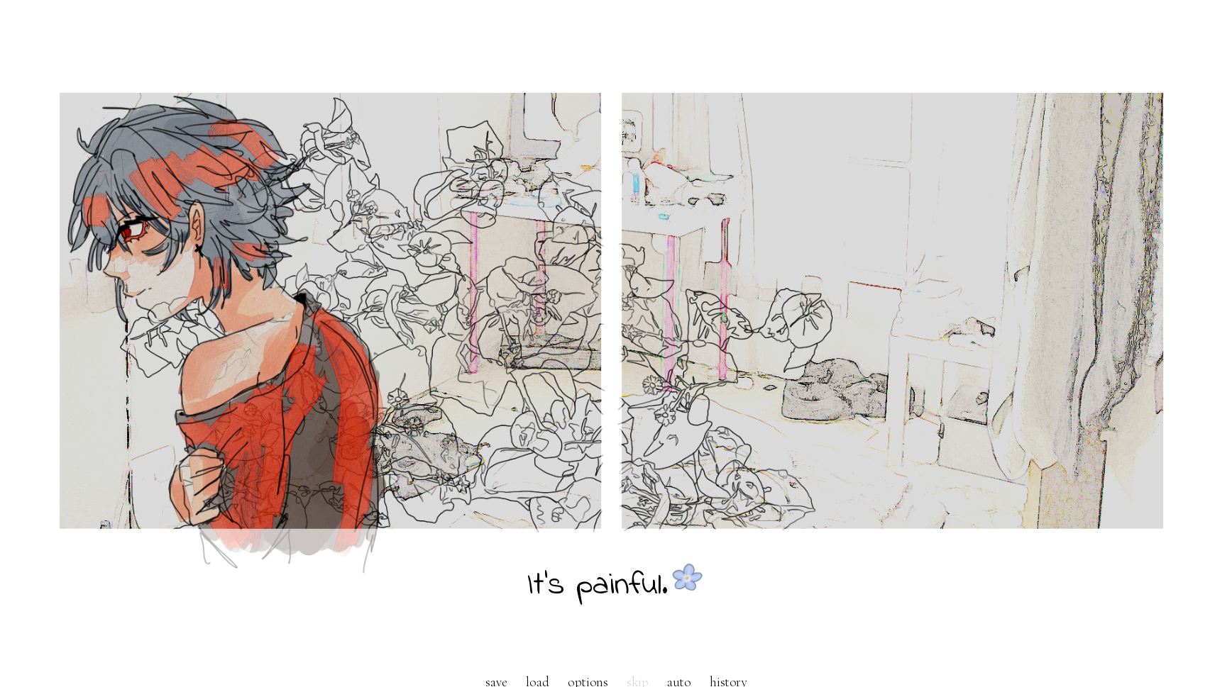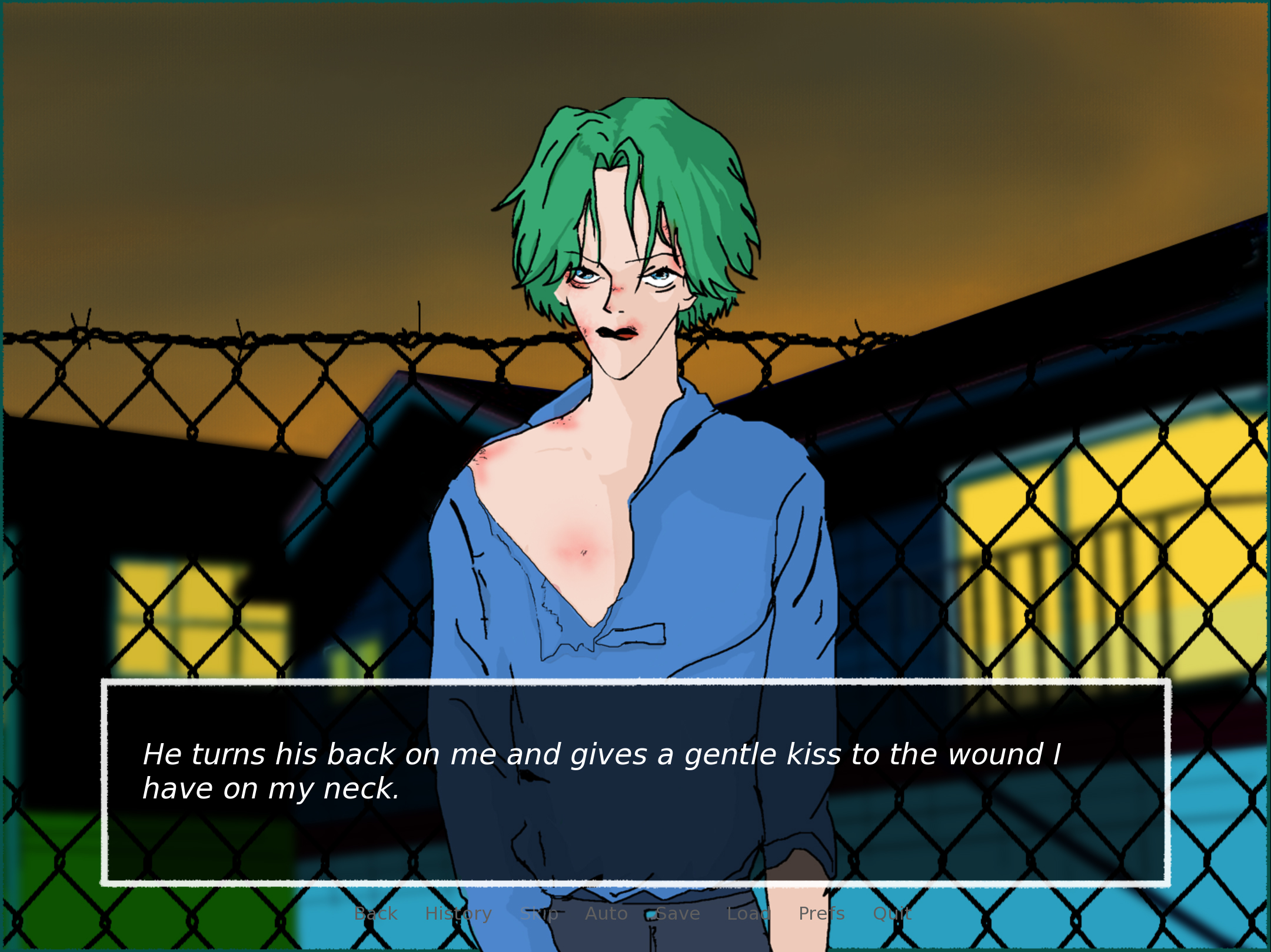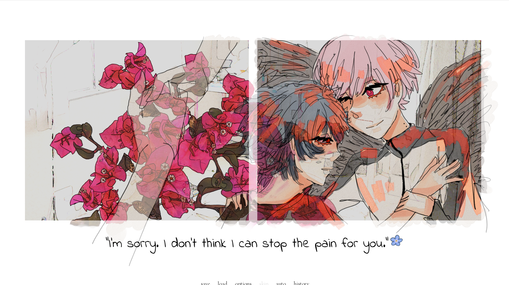 a love colored blackbirdhttps://fuwawuri.itch.io/a-love-colored-blackbirdThis one is a kinetic story about a suicidal MC and a blackbird who comforts him. It's not very clear if the blackbird is a guardian angel, a friend, or a figment of MCs mind. The best thing about this one is just the presentation, it looks pretty classy and has an interesting "split screen" layout that I haven't seen in any other VN. Unfortunately the entire VN is written in purple prose and I just didn't vibe with that at all. It's only 10 minutes but if feels like an extended poem instead of a narrative. 1.5/5