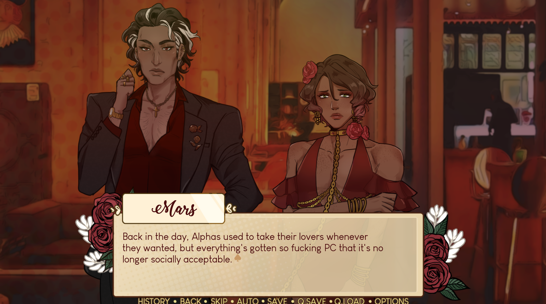 Today's VN was "Another Rose in His Garden" I normally try to link to them but the Itch.io page I got it from is gone now…This one is clearly not aimed at me, it's Omegaverse themed and actually the first Omegaverse thing I've read since I have negative preconceived notions that this did not remove.