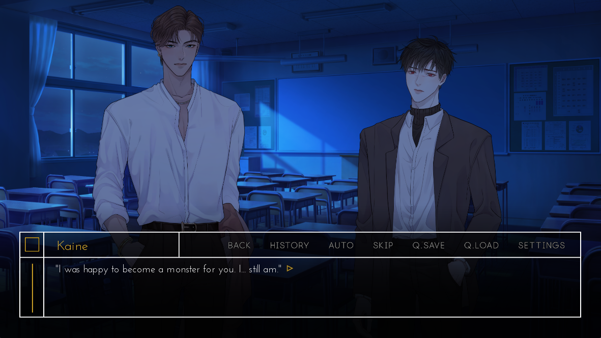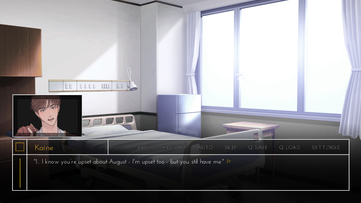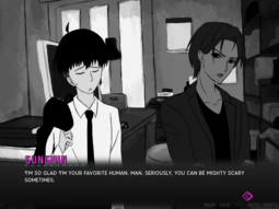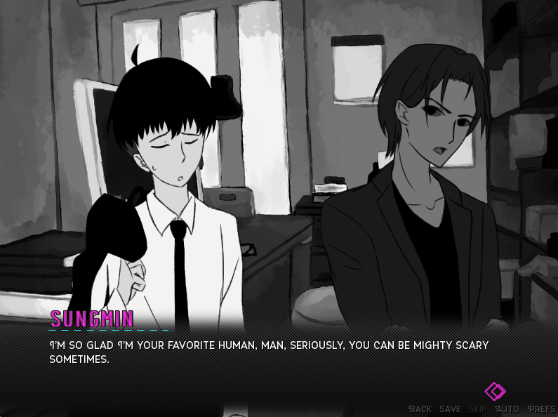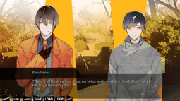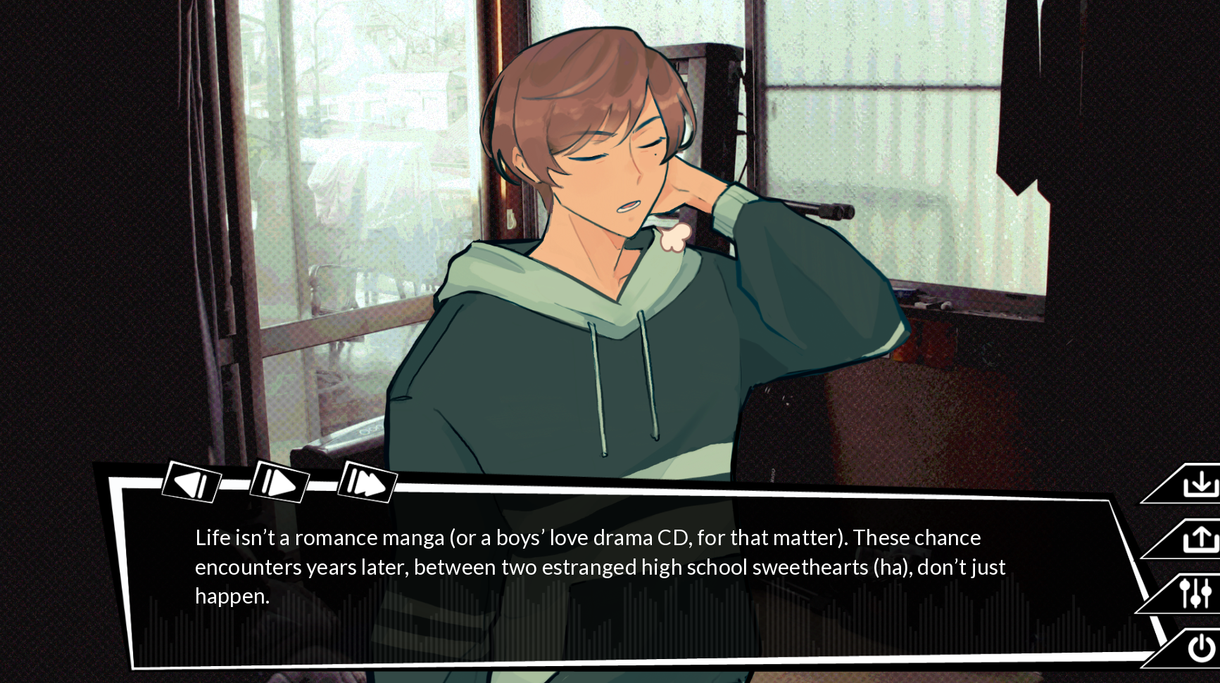 I will say that the story can be kind of disorienting when you start. You're not given much context, and the characters' relationships change depending on where you are in the flowchart. This is further complicated by how much you'll be jumping around the flowchart. The VN is sort of light on romance, but I personally enjoy the "you’re given X hours to seek a way out of this life-threatening situation" genre of VNs, so it was still nice to see a BL interpretation of it. Also, one of the boys has a giraffe neck, and it bothers me.