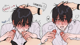 sometimes i get annoyed when there's more than one guy per dick in blowjob art. there should be a dick (or more) to every guy. i give picrel a pass though because it's cute.