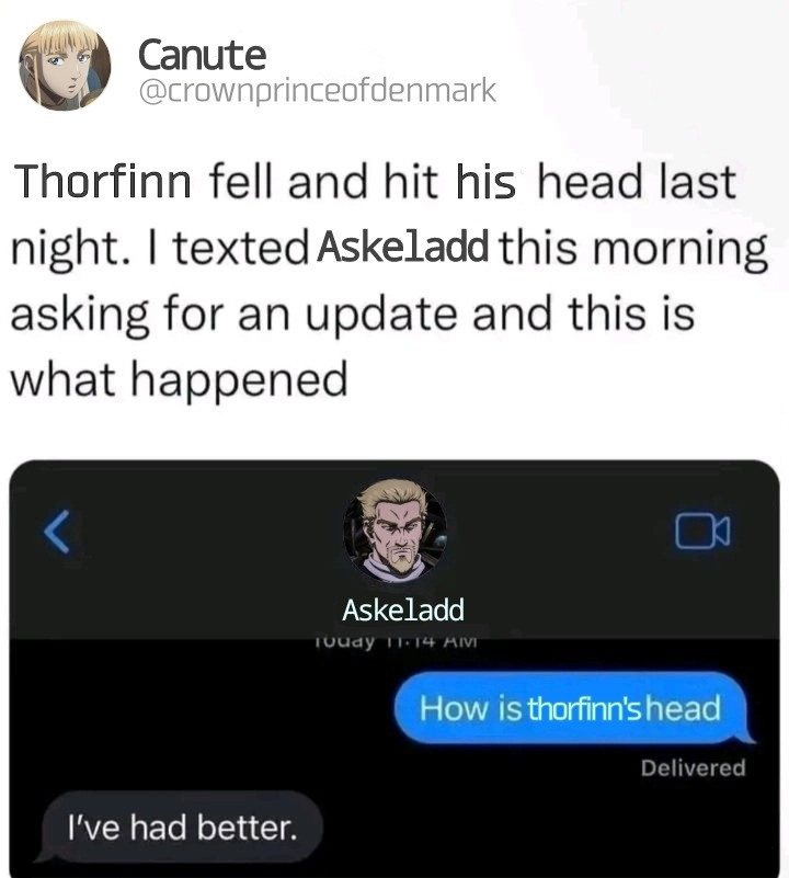>I'm sure they will deliver some Bjorn bottoming, after all these months they won't settle for just a basic thorfinn in the middle r-right?holy crap, bjorn getting double dicked would be All Kinds of Based after such a humongous wordcount of build up… even though bratty shitstain feelings-denier thorfinn getting sandwiched by two grown ass men is still pretty funny and neat