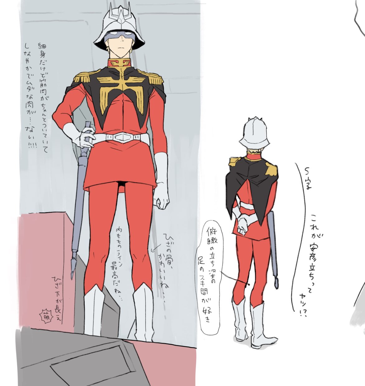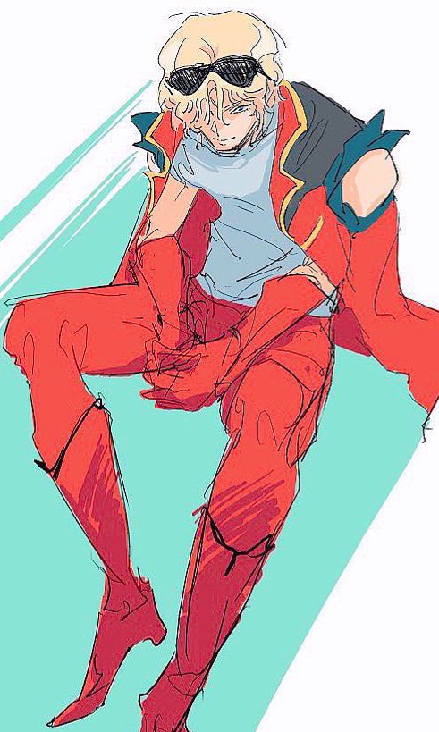 >not that it's unusual for old school superheroes and sentais to wear tights or anything but the red makes it extra good.It's not but he's still the only one in Zeon I remember wearing leggings. It's not like he's in a scifi organization where they're common. Even Kycilia wears normal pants but no this guy went for red leggings for his custom Zeon uniform, of all things. What a slut.