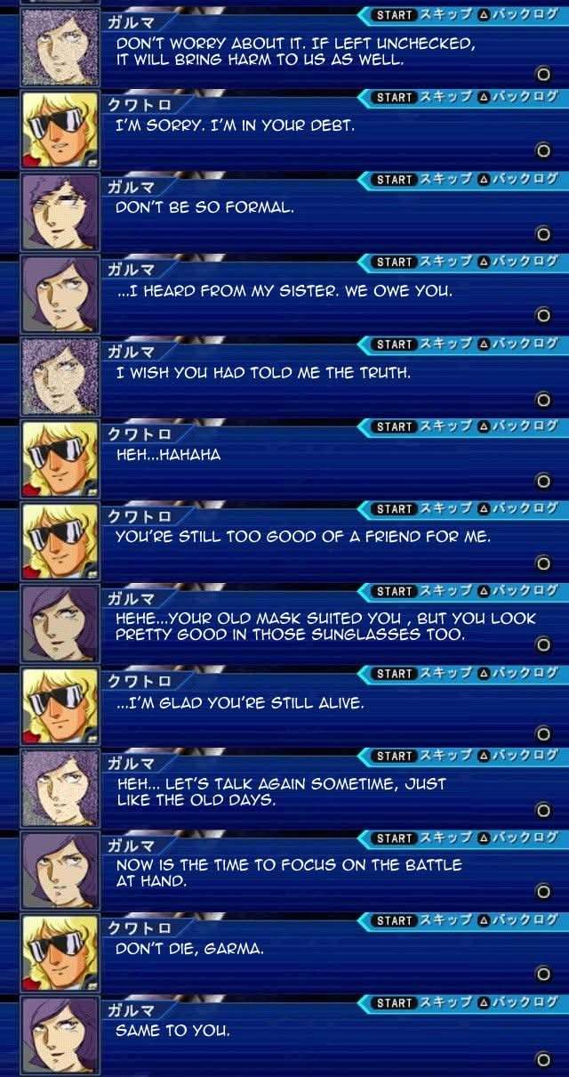 Char goes all pissy on Garma asking to be friends again, but the Super Robot Wars one is more interesting imo, because Quattro in Zeta is very looking back on his past with maturity and some self-awareness. And his reaction to Garma's being alive, comes across as startlingly genuine.