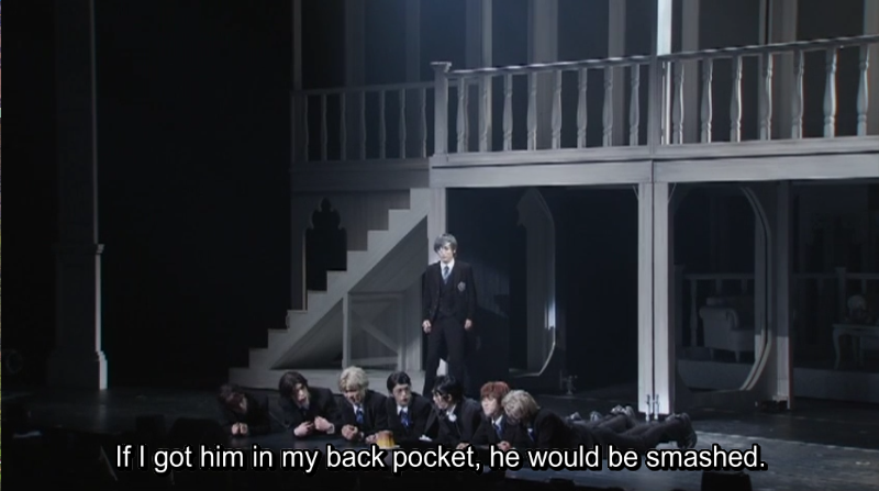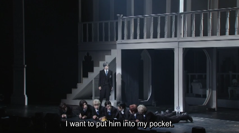 that arc? Admittedly I shouldn't have been giggling at how old and tired Ciel looked in Sebastian's arms in this one (and his ear is so flushed in pink compared to the pale makeup on his face), but at least he got to lean into his ear and show leg! The child actors were never allowed to show as much skin or linger on shippy scenes. The staging for Green Witch has potential to be so much more varied and interesting than Public School, so it won't be a complete loss, but I don't understand why they wouldn't outright switch to an adult Ciel actor so they don't have to keep finding new kids and altering things to be safer for them.