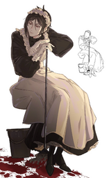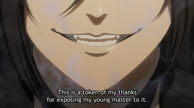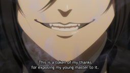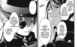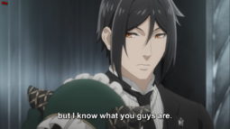 >I also considered the demon being someone other than Sebastian but I don't know if Yana would introduce other demons this late into the story.You're right, at that point we're in the last arc of the manga, even if it looks like it's going to be a very long one. I think right now if anyone will be reveal to also not be a human it will be John Brown. With how much the anime was inspired by things from the manga that weren't revealed yet if Yana said he were an angel sent to work with the queen I wouldn't be too surprised, even if his role would be different from Ash's role in the first season. I don't think we ever saw him without his sunglasses? It reminds me a little bit of