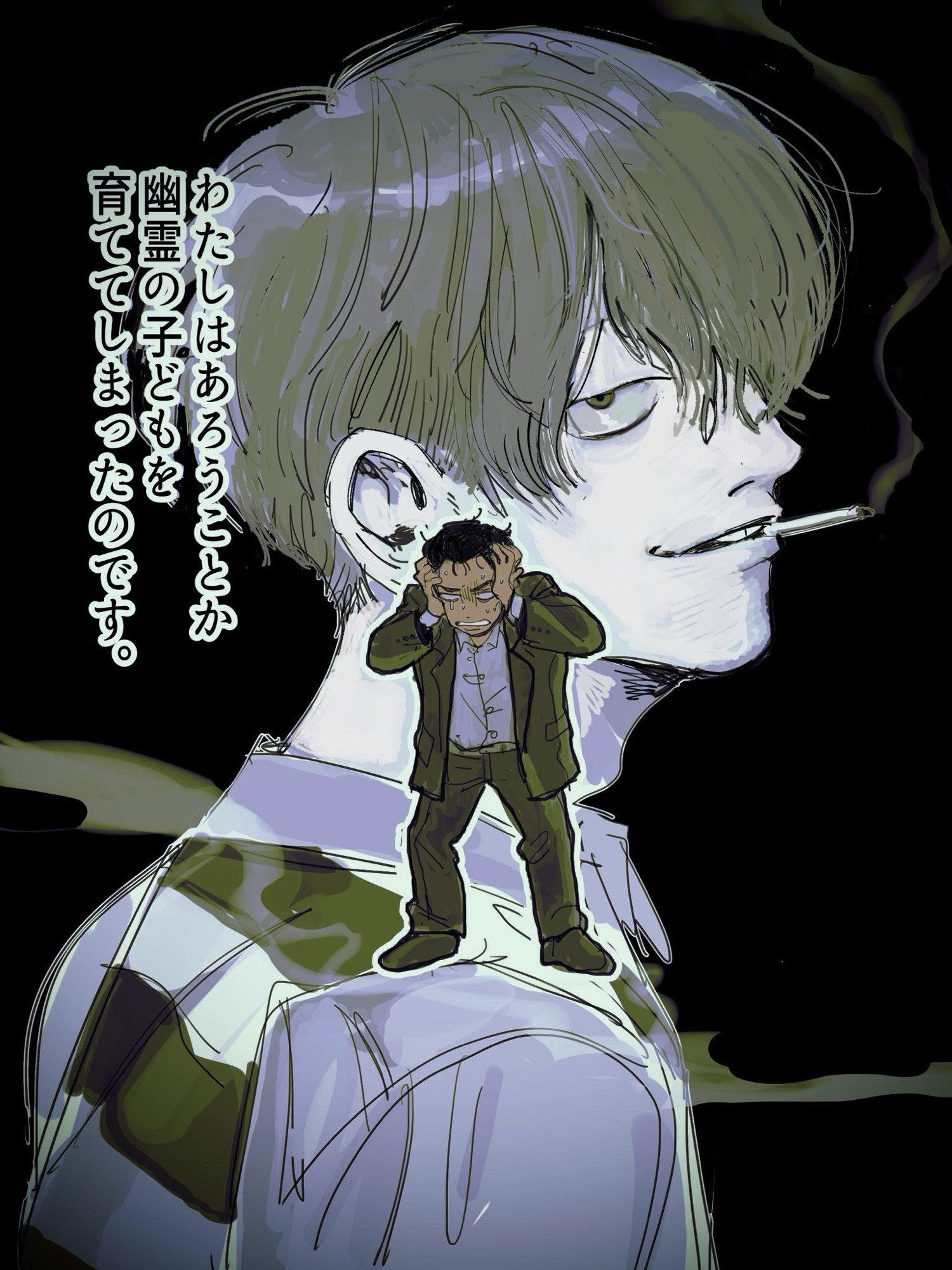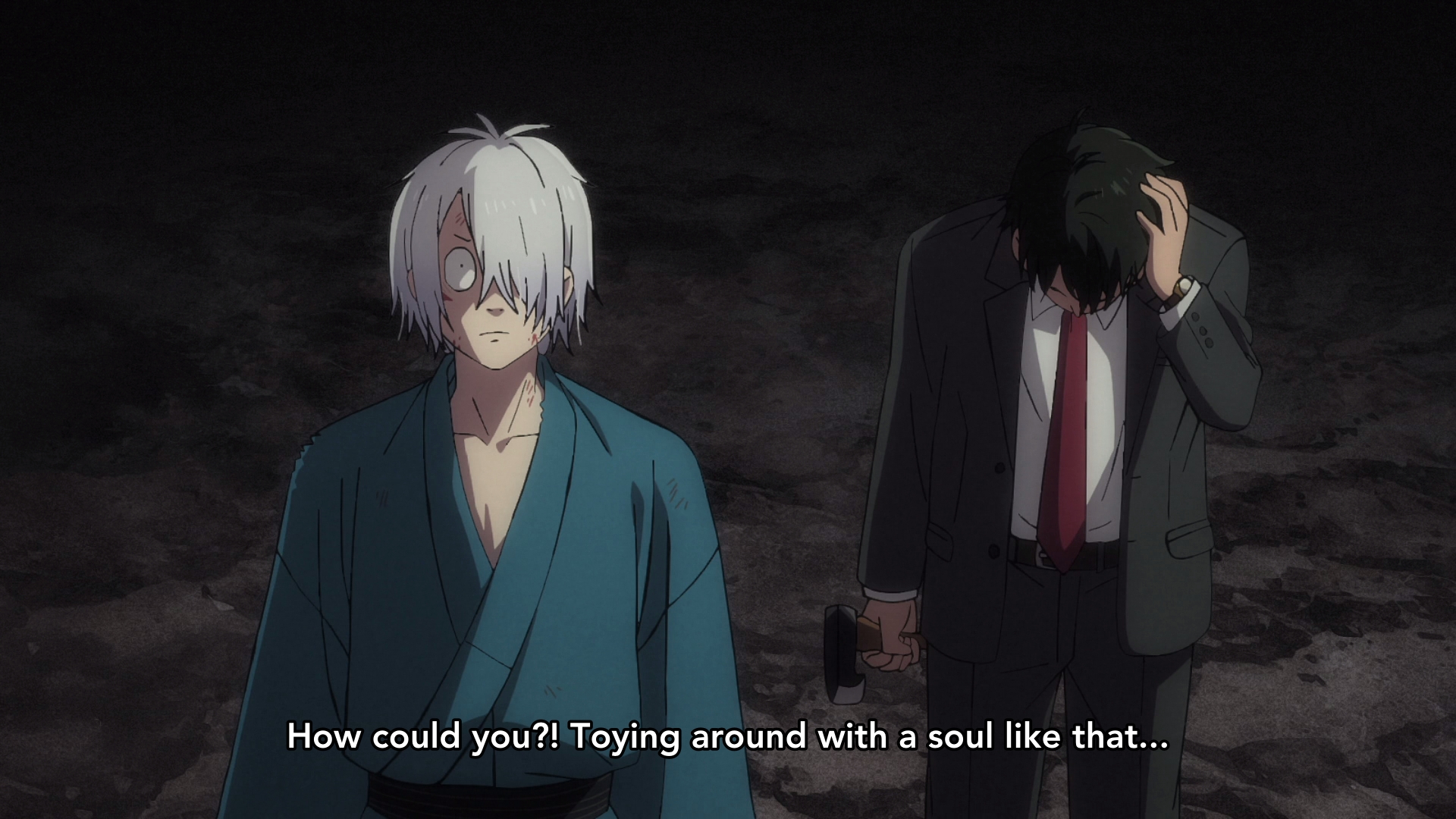 “Mr. human…!” She cries, a shrill, kitten-like voice. Mizuki locks gazes with her and shakes his head, while Gegero takes one instinctive step closer to loom around him, his taller frame almost dwarfing Mizuki’s, as he seems to grow higher still (Mizuki isn’t sure if he can do that, or if it’s just a trick of perception).