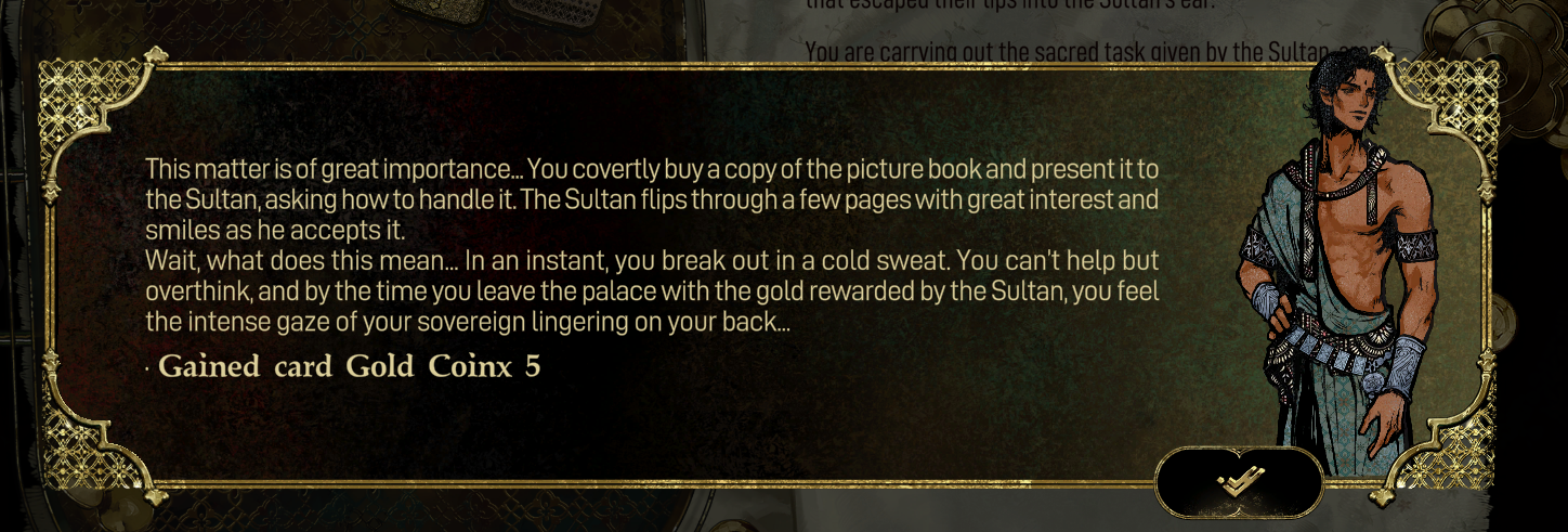 lmao you showed the Sultan the doujin. I love his fucking reaction to it. You get a conviction card if you say "Let me take a look," which is important later on for rebellion and getting people on your side.