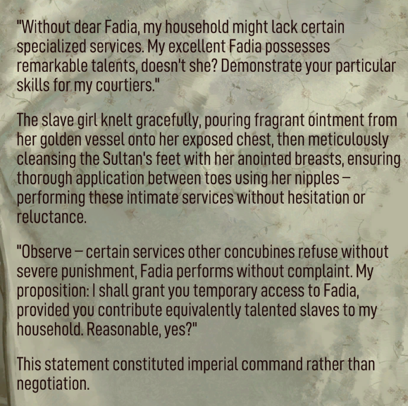 It seems 3 slaves aren't that advantageous than Faraj. I keep abusing Aziz making boxes for some achievement, Zephyr is bought by Arumina and Inal is pretty useless rn. At least I could fuck Faraj consensually. It's kind of bothers me he looks like Arzu I keep mistaking them. Cute copycat but somewhat boring. Is there a way to fuck Qais without turning him a cultist/using carnality? Hassan has poem giving Passion stat so it's all RNG dependant. I once used his poem to turn Lumera into noble but it seems locked from Fardak marriage event. Hassan's poems are too broken. Doesn't even eat coins.