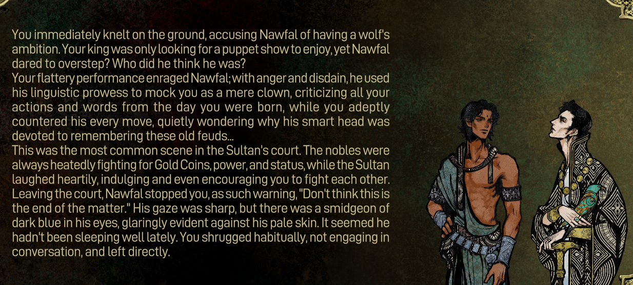 Nawfal getting sucked into the Sultan's Game after the most popular guy contest and you and a bunch of other random characters have to be whores around the Sultan. The Sultan's gaze is lingering on "someone" and that's on Nawfal. This is one way to make Nawfal the vizier, but it's all RNG shit and you won't get Nabhani 100% on your side if you do that.Losing is not a bad thing btw. The fate points gathered will help you get more help via characters, stat boosts, money, or equipment. It's also very explicitly implied that