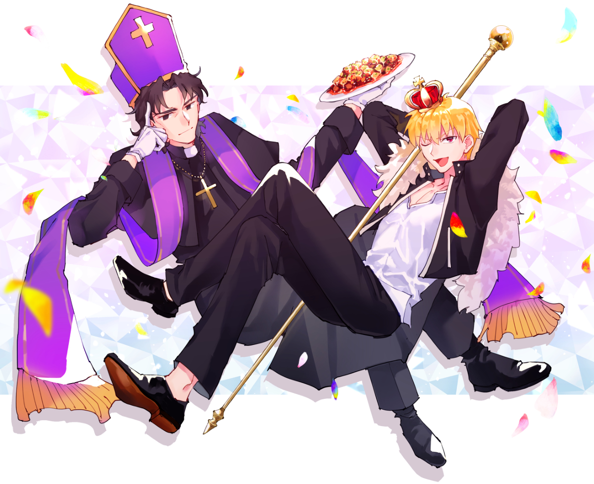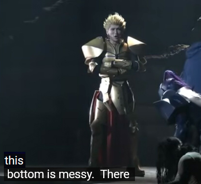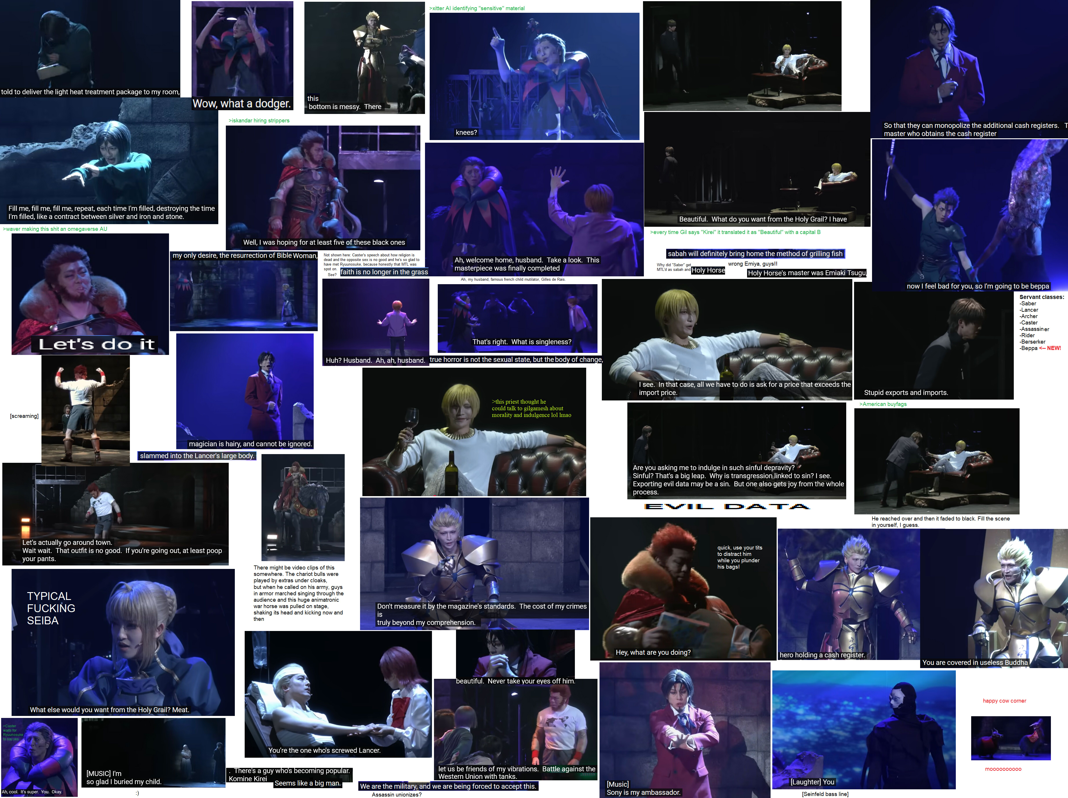 It's a huge mess with many bad jokes but I collected some of the youtube MTL that made me laugh and finally compiled them into one collage. What you wouldn't get from these is how the music is, it opens with bagpipes and during the curtain call it reveals it's real fucking bagpipes they were blasting during Saber fights. I think the best songs came in the second half, in particular Lancer's brief "I want" song, Rider's army choir, and what my friend called "the surprise NTR duet" between the girls. The first half, nearish the middle I think, had a barely musical ""rap"" between Rider and Waver that was terrible but still made me laugh because of Waver yelling incredulously at Rider's ideas of a good time.