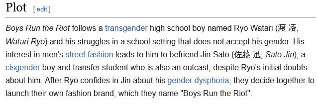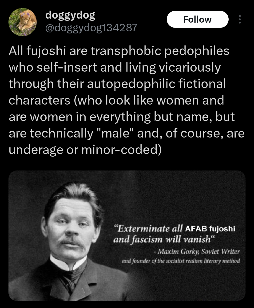 >>11922>I know everyone here has issues with them but to me it's not something that i'm worried aboutI think the point is that you can't put trans 'fudans' in the same category as regular fudans because 99% of the time their behavior is the same as fujos except with a lot more overcompensation and/or shitting on fujos to make themselves feel more valid, including the 'making yaoi their entire identity' thing. Sometimes fudans join in on the fujo bullying if they're the misogynistic type, though, but they're less likely to complain on the basis of stereotypical 'toxic yaoi tropes' and more on the fujo content not being manly enough for them.