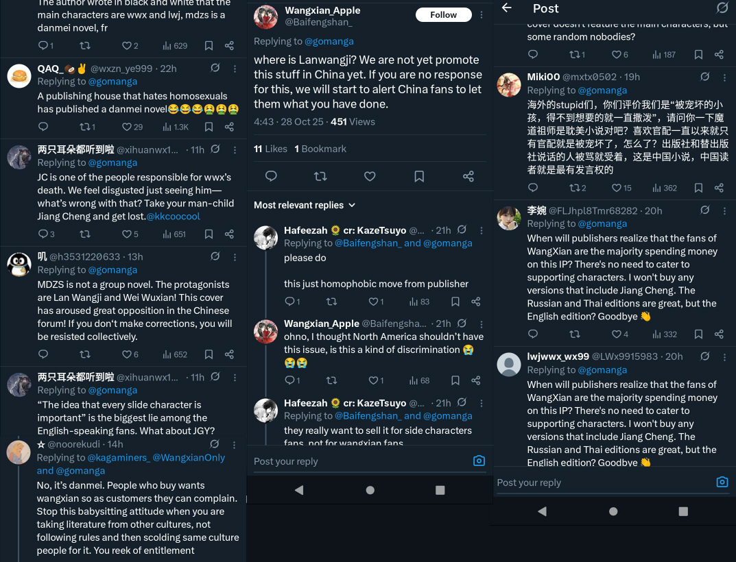 >>10890Chinese social media got wind that a character they don't like is on the cover of an American special deluxe edition. They put together some English language complaints to then spam in the replies to the publisher. I didn't cap the comments that were just the puking emoji fifty times but here's a rough collection of the different arguments they're making. Some of them are @ing the artist of the cover, there's quite a few saying the artist has never read the novels and doesn't understand the story, as well as ones calling them homophobic, despite it being the publisher who decides what goes on the book. I could have sworn I screencapped three replies in a wrong that all ended with "@(artist) you are DISGUSTING (puking emoji)", but yeah. Some are very copypaste, some are just replying fifteen times in a row in Chinese. Totally batshit. Managed to be worse than the western fans when they saw the font on the first TGCF release, and the wildest part is that Chinese trolls seem to think they can actually get their way by saying "you won't get my money, neener neener".