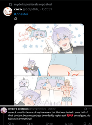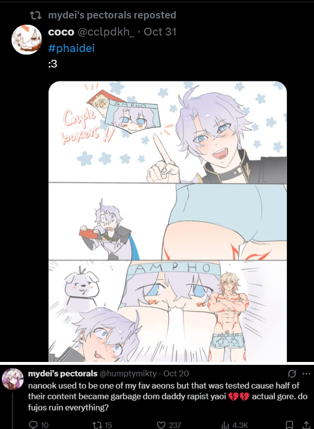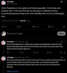 well my yuri has GIRLDICK actually! and I think that truly speaks for itself. They really go into spaces for homosexual ships and try to turn them heterosexual while talking some nonesense about all kinds of queer people being valid. It makes me not want to call myself a fujo if this is what it has come down to.