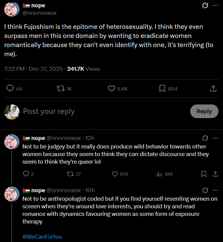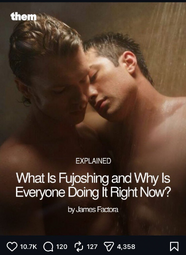 fujo accounts that strictly post about omegaverse, mpreg, the bottom's pussy, and their fixed yaoi stereotypes where the bottom is literally a woman and the top is a dommy daddy. Can't they go read their rapeslop booktok romances and leave BL alone? Cuntboy used to be a niche, it's not a core part of BL and it should never be. If you're not reading BL to see two GUYS with DICKS having GAY ANAL SEX and FROTTING, then you're not a fujo and shouldn't call yourself one. Similarly, I saw some replies that said