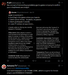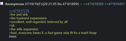 >>10908There are just some people who take it as an affront if something isn't always about the mc that they self insert onto and they get especially angry if the character other people like conflicts with the mc in any way. To me it's not different than moid shounentards who get triggered by male rivals for being "mean" to male mc, or yumes who go on tirades about misogyny because you didn't ship the "literally me" relatable shounen girl with a male character and instead shipped the male character with yaoi instead. There are a subset of fujos who see anything that isn't the main couple as a betrayal in the same way, especially if you like a character who was an obstacle, an antagonist, or if some people break up the canon couple and ship something else in fanon. Nothing is canon there but it reminds me of Genshin fujos who insist they're getting coded messaged from the devs and which ship is more "canon" and trying to bully out "rival" fujo ships. And if that's not an option, they'll just fight each other about what "canon" m/m ship is the best even if they don't share the same characters at all.