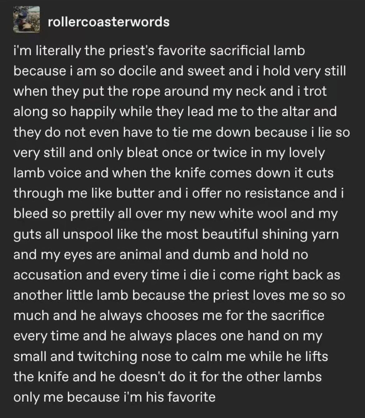 >>19>brothers having a potentially secret, scandalous and unhealthy relationshipi love this trope so much, god damn. wholesome sibling relationships are great and all, but there's something about the perversion of brotherly love and intimacy that just gets me every single time. especially when one or both of them are aware that this is definitely not okay, but they just can't help themselves. bonus points if there's twincest involved.