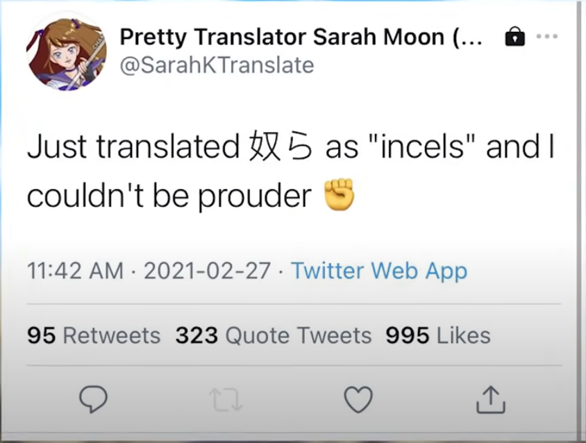 >>1367I remembered seeing the translator (a tranny, of curse) and one of his friend and fellow "translator" (a handmaiden, of course) trying to justify their choices on twitter. Their argument was basically that they worked sooo had doing research to understand the manga and characters better by interviewing completely random and unrelated American troons. I wish I had screenshots.