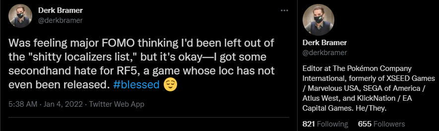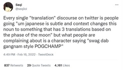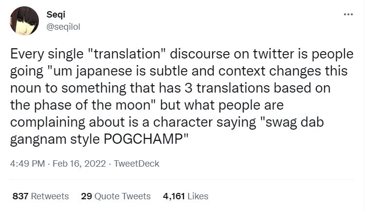 >the jp would have like a snarky oneliner at most and the eng will insert no joke three paragraphs of ooc text bc "epix dunking"I don't get when localizers do this, and then remove entire lines or dialogs that are plot relevant.