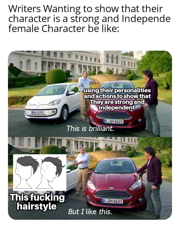 The womanhood is almost always the entire being of the female character, whereas a man can be Darth Vader, a funny politician with anger issues, a serial killer, a volcel detective or a middle aged, tired smoker. In most media women are limited to like three stereotypes and the essence of all of them is to please the het audience. It's even worse with anime/manga since most of the audience here are insecure otaku that desire their devote housewife or yumes that want their super feminine princess. The rest are usually just super pretty smiling side girls.