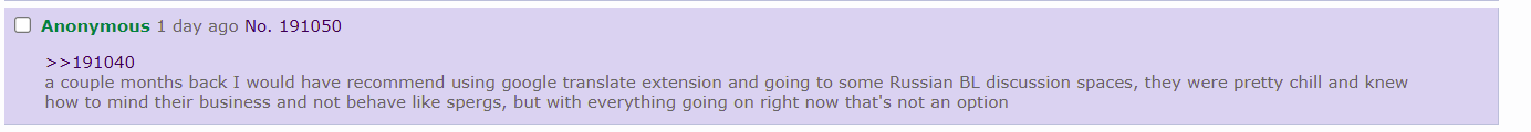 >>482so generally what's the culture like in those sapces, according to lc anons, russians fujos are much less autistic and spergy
