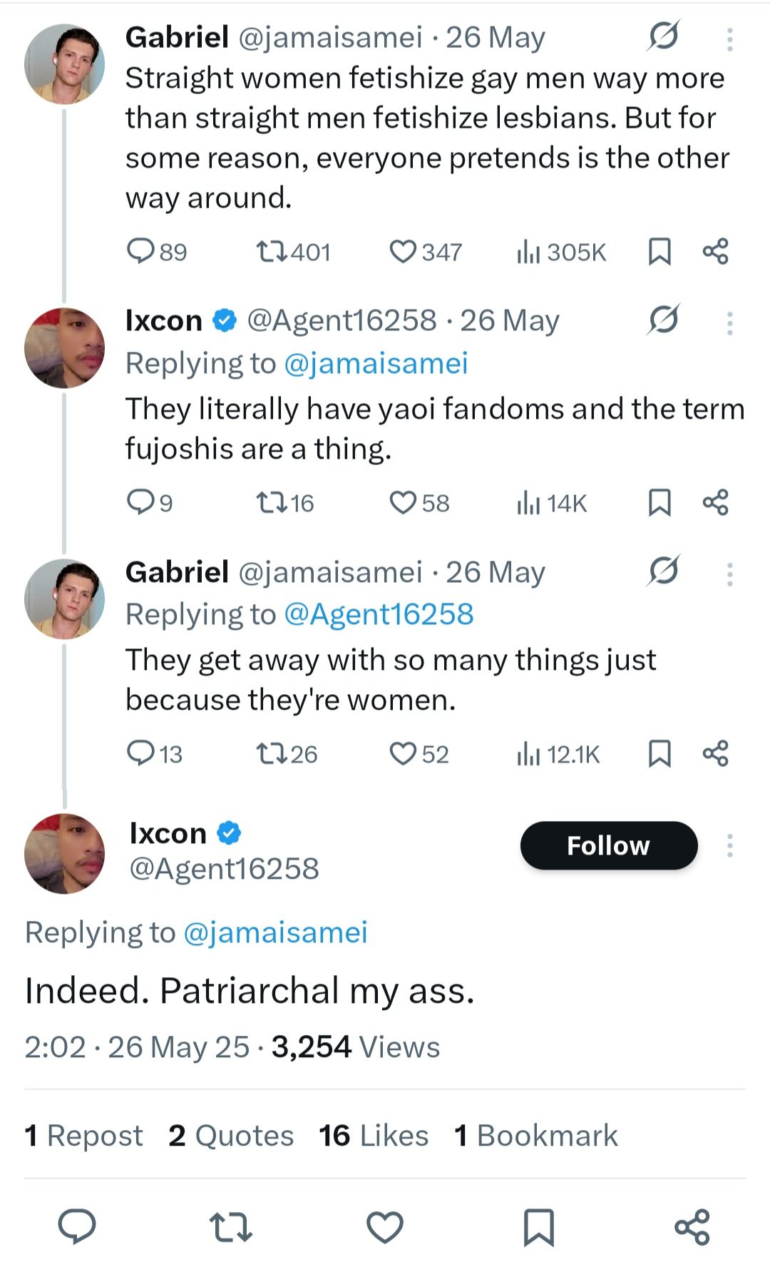 >>3747>you'd rather see men being a gay pairing over seeing a plot relevant strong and independent female character because you're sexistI hate this one the most and in recent years I've seen SJWs mix racial politics into it, like they expect you to prioritize interracial M/F over M/M of two white guys or else you're racist. I only like animanga so it doesn't apply to me but who gives a shit? These people need to stop overfixating on the identities of their blorbos. Every day I get more convinced these made up rules/standards forced on fujos is just hetfags and yurifags being mad they have no fancontent so turning it into some woke thing is their way of taking it out on us.
