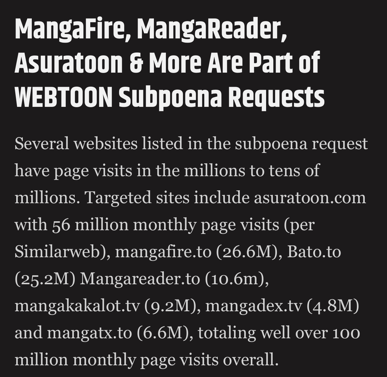 Yeah a few days ago webtoon subpoenaed a bunch of piracy manga/manwha sites. Personally I don’t think it’ll stop people from pirating and will probably just make pirates more annoyed.
