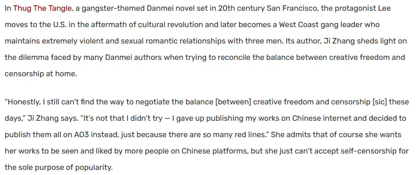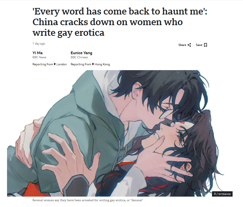 So this has been confirmed by all my Chinese mutuals, who have told me how hopeless things have become there and it's only getting worse. In 2014 obscenity laws were passed in China that mainly targeted mainstream porn sites, but gay content was also included and targeted, forcing Chinese BL authors to use more 'flowery language' if they were writing something intended for an 'audience' in public, but on foreign sites (Western but mostly Taiwanese) they could be more free, still it was gradually building up to this, starting from 2022(according to my mutuals) the underground sites were removed en-masse, now the Chinese government even forces foreign companies to meet their standards. If you are a Chinese citizen who even writes anything about gay romance, you will go to jail for it