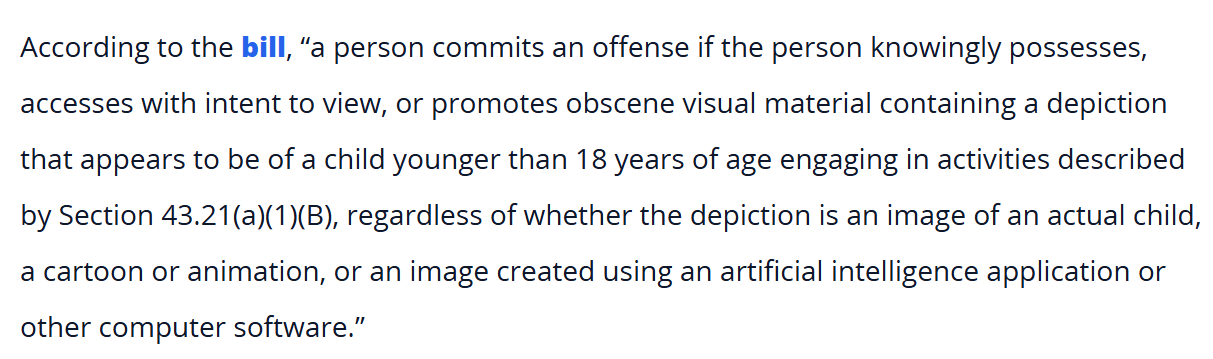 That "drawn/generated depiction of minors" bill (SB20) went live in Texas on Monday. Apparently a weeb porno distributor (JAST) was removed from San Japan (Texas con) over the weekend. I'm interested in what the first publicized case of this will be. It would be on brand for shit stirrers to start reporting NSFW artists who live in Texas, for example.