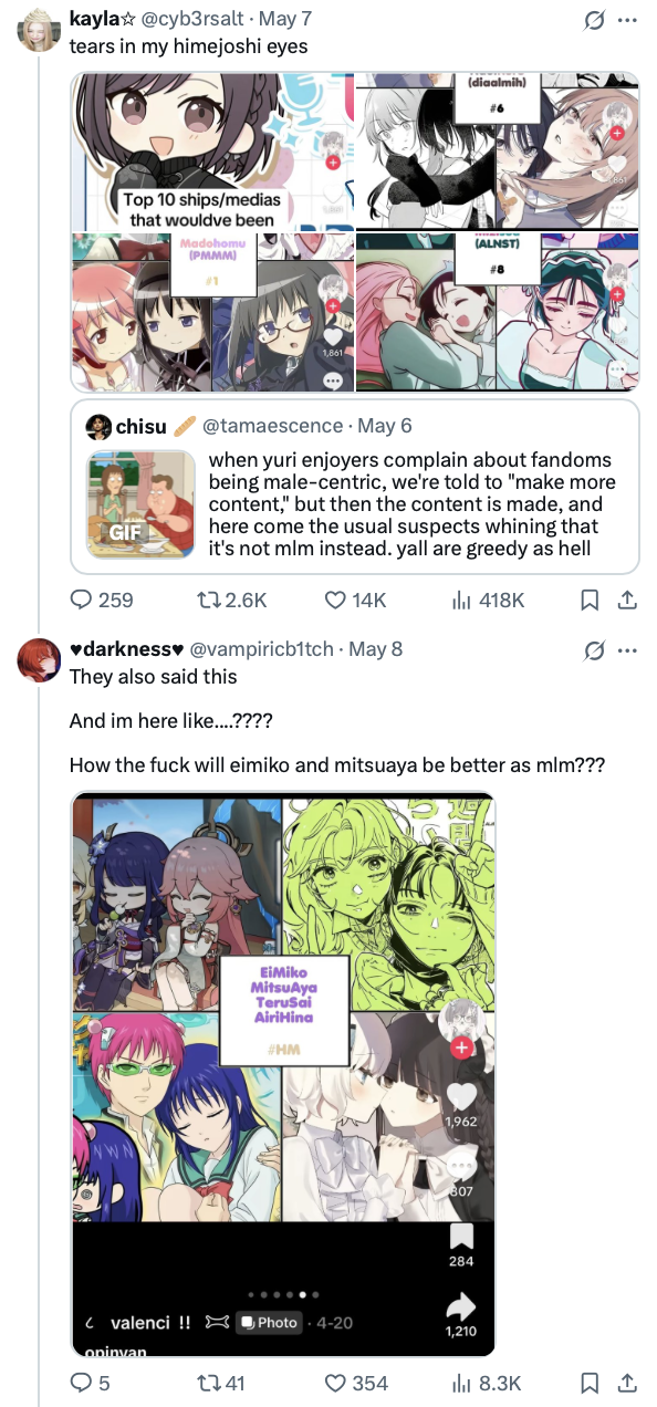 >but in terms of fandom F/F almost never tops a fandom list. I agree. This was another point that I wanted to make by saying the last part. Yurifags get so much to work with and yet they do NOTHING with it. Only complain about fujo's creations and community.
