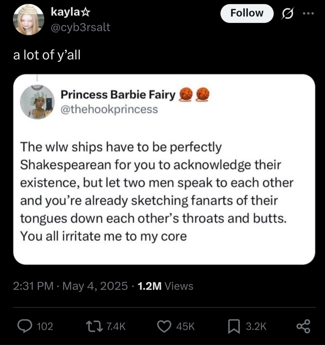 It's pretty telling that the loudest whiners usually do have the blandest taste in yuri dynamics so they genuinely don't understand why the bland best friends aren't launching a ton of fanworks just because 'girls kissing!!' (Unironically, 'transbians' are just selfinserting and don't understand that most actual women need more than this to get invested. Only MtF I have seen who liked BL was attracted to men.)
