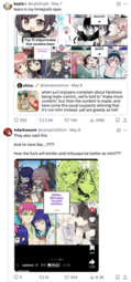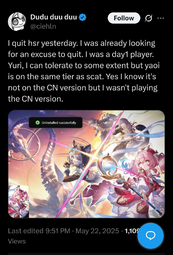 >>8743https://x.com/mcdowell_d14586/status/1925686867300589840One of the replies is a LADS/Nikki fan crying about translations and hoping for them to get reported. Replies full of people crying about straight shippers being oppressed. This is the shit we have to see from gacha "feminists".