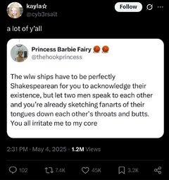 >>8596>>8603To me, yuri gets a lot more bait and maybe more canon content but most fans are men, so there aren't a lot of fans who make their own creative content around yuri. I associate yuri fandom more with male Redditors making yuri memes on Reddit. You also have fandom women performatively shilling yuri and whining about nobody caring. "Step on me mommy!!", "yuri is wholesome / sophisticated while yaoi is cringe", "why no yuri on ao3?!" etc.