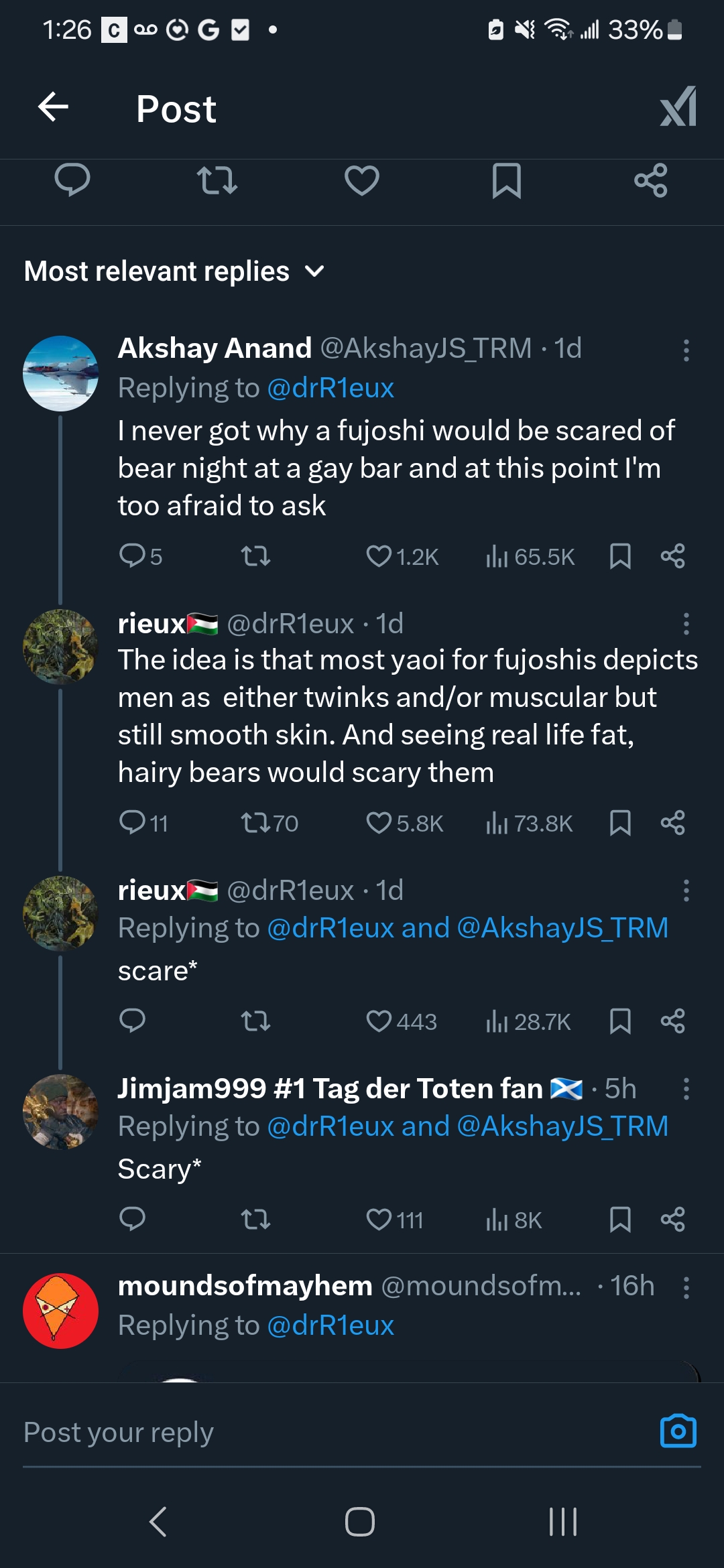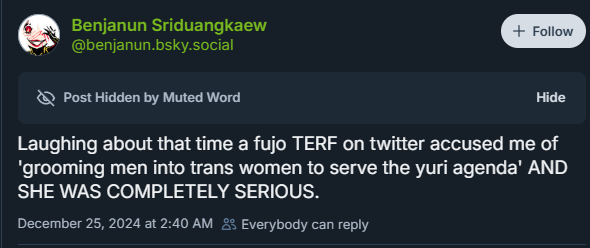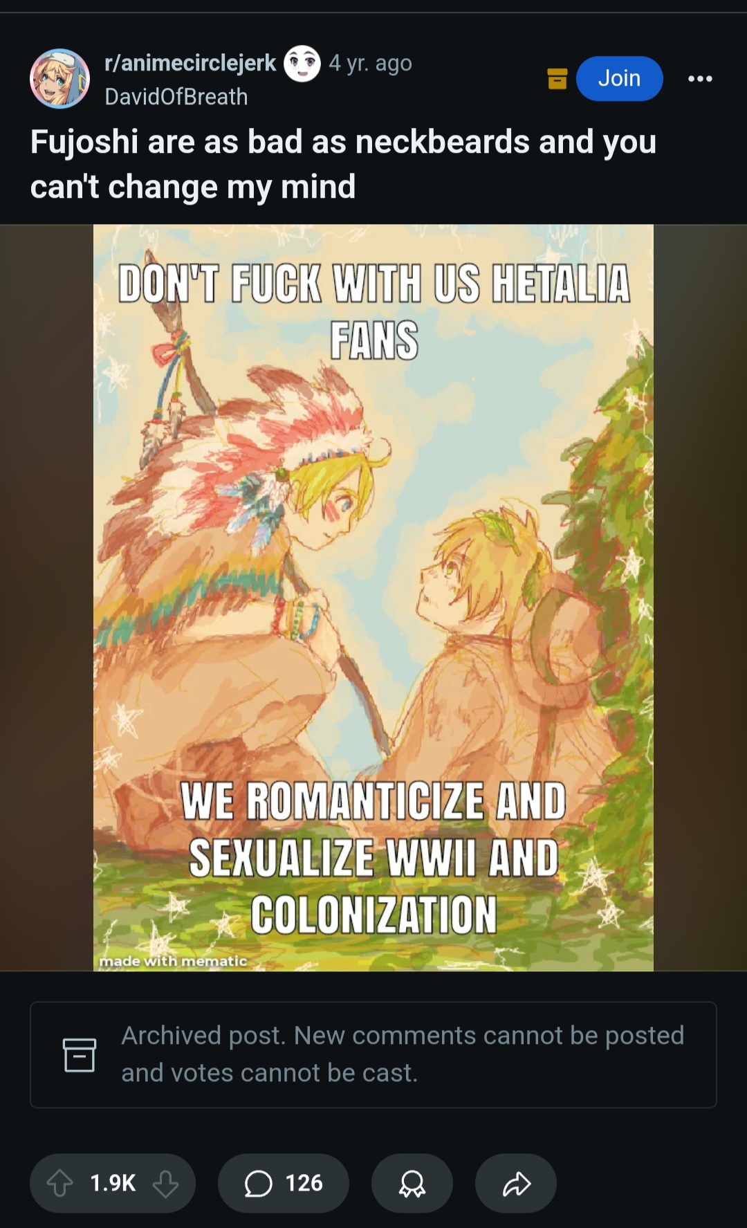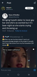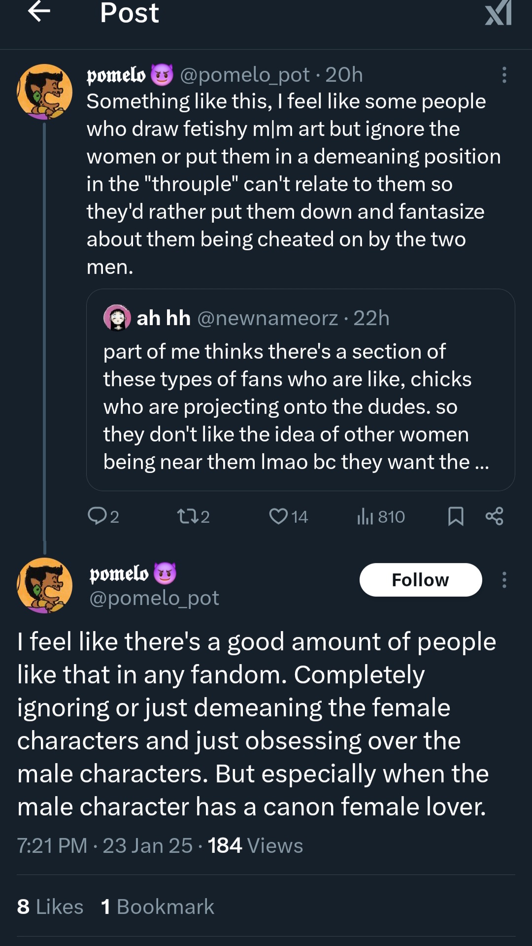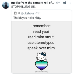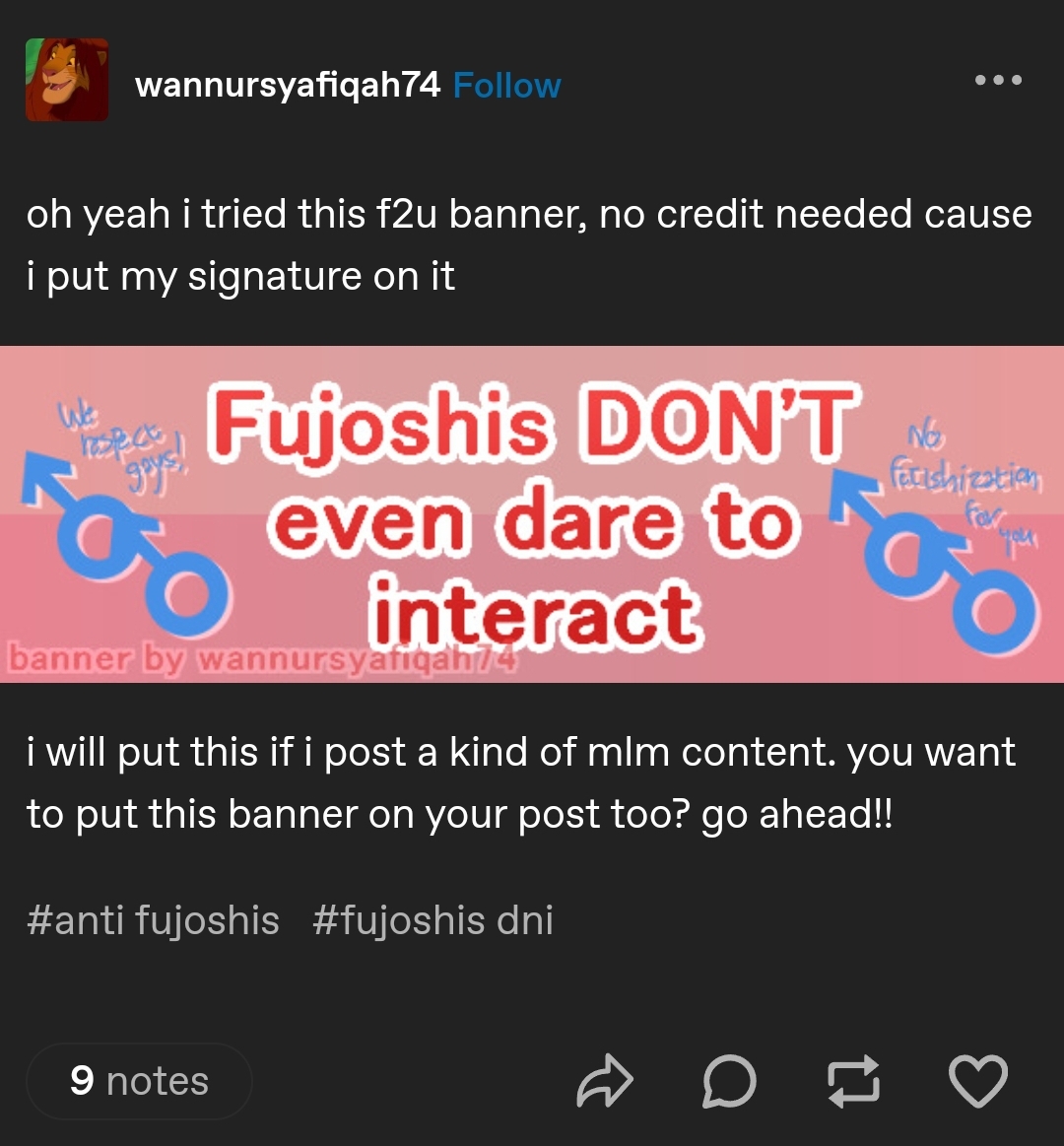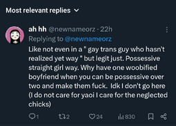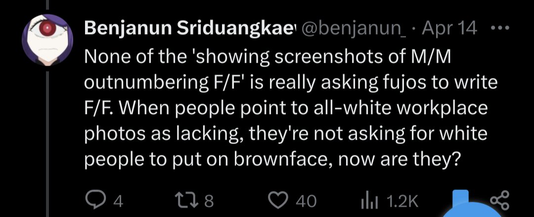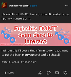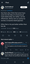 >>8726>This has been going for at least two decades nowYeah, fujos have always been criticized for 'fetishizing' and there have always been gay men who dislike BL and speak out about it. All that's new now is Aidens/theythems bullying fujos out of their own spaces to prove they're legitimate and NLOG.