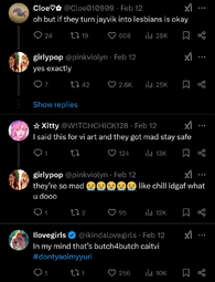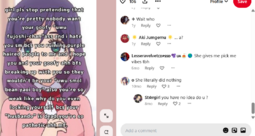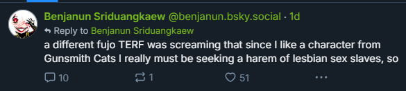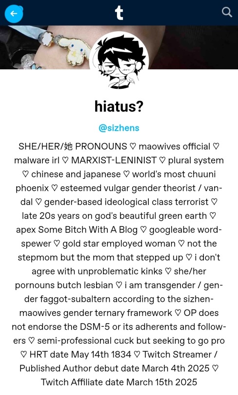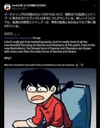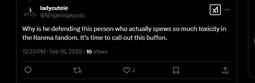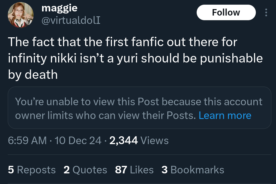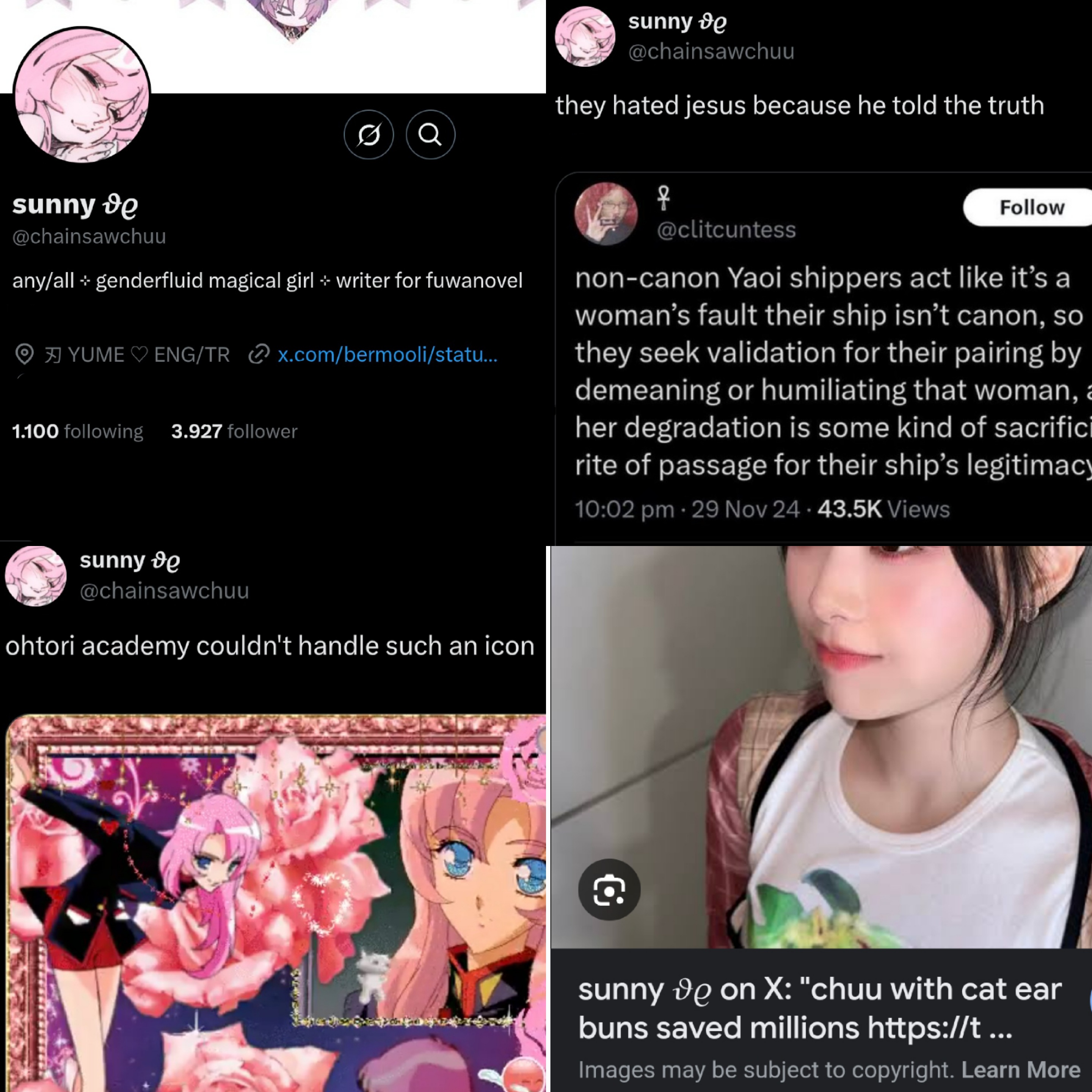 >>8743https://x.com/mcdowell_d14586/status/1925686867300589840One of the replies is a LADS/Nikki fan crying about translations and hoping for them to get reported. Replies full of people crying about straight shippers being oppressed. This is the shit we have to see from gacha "feminists".