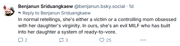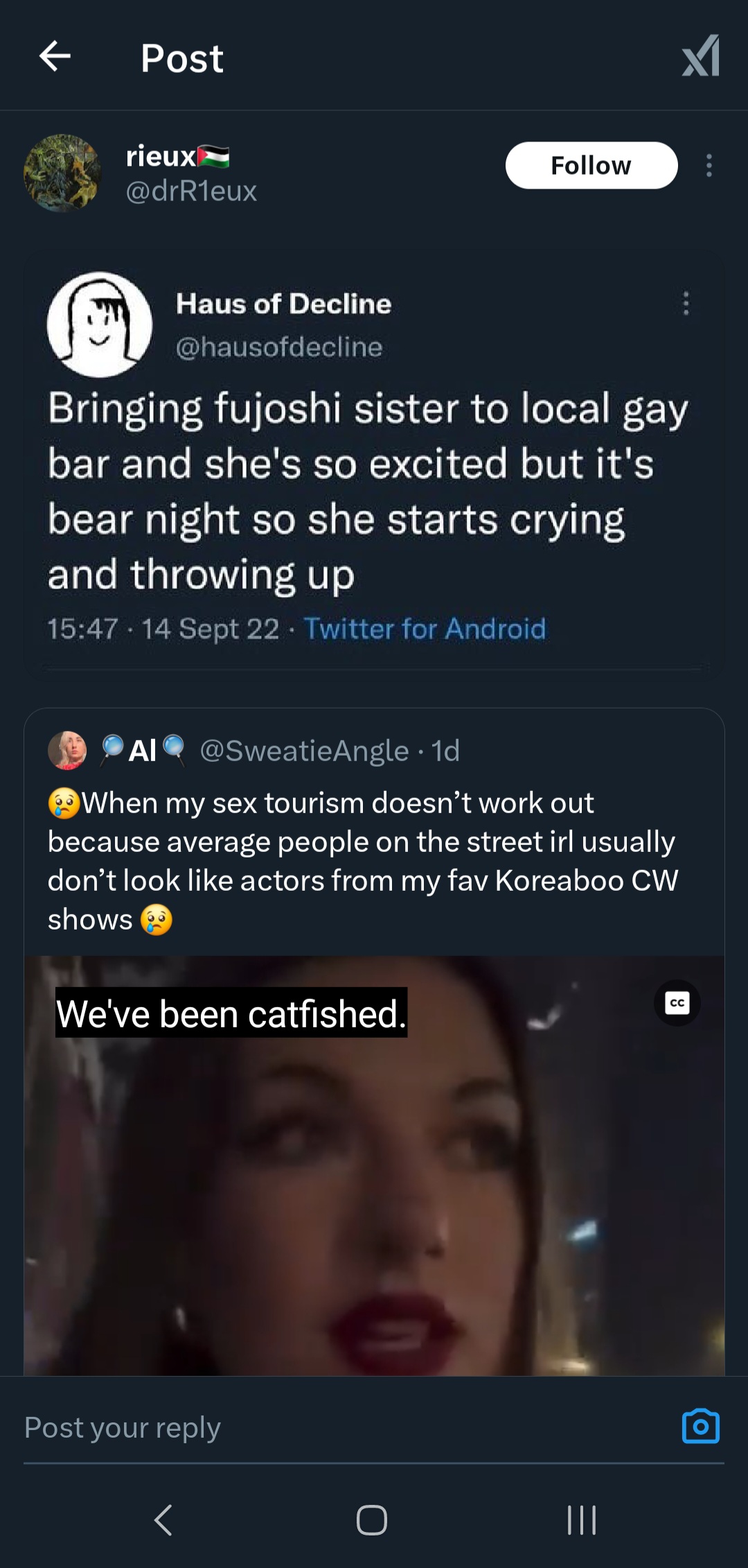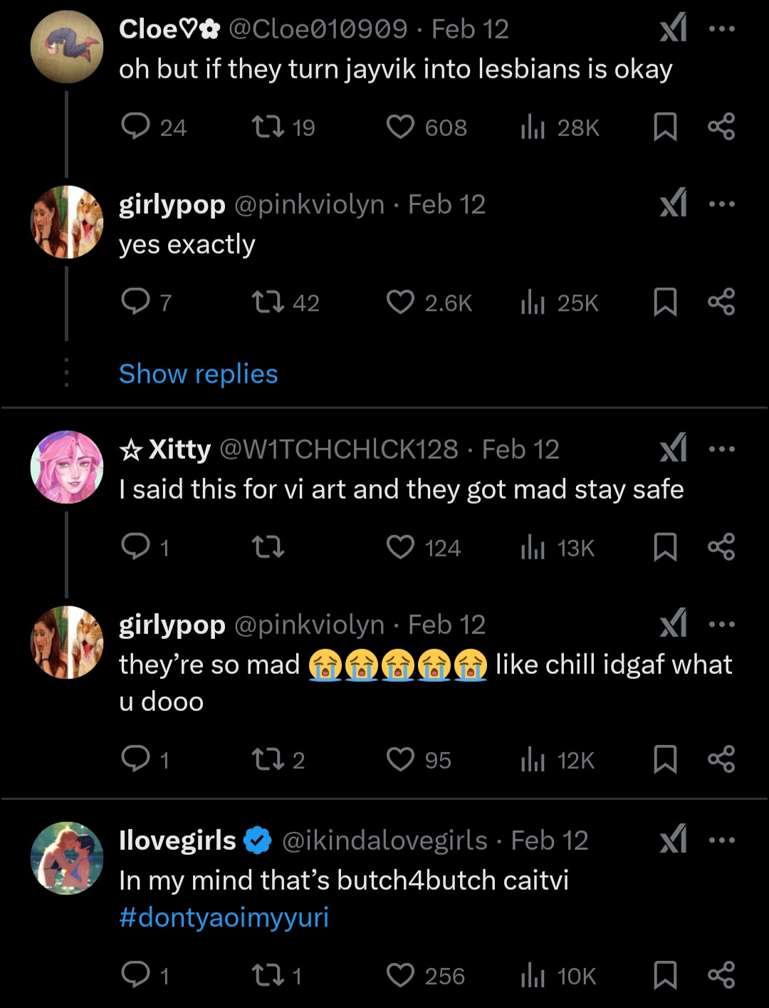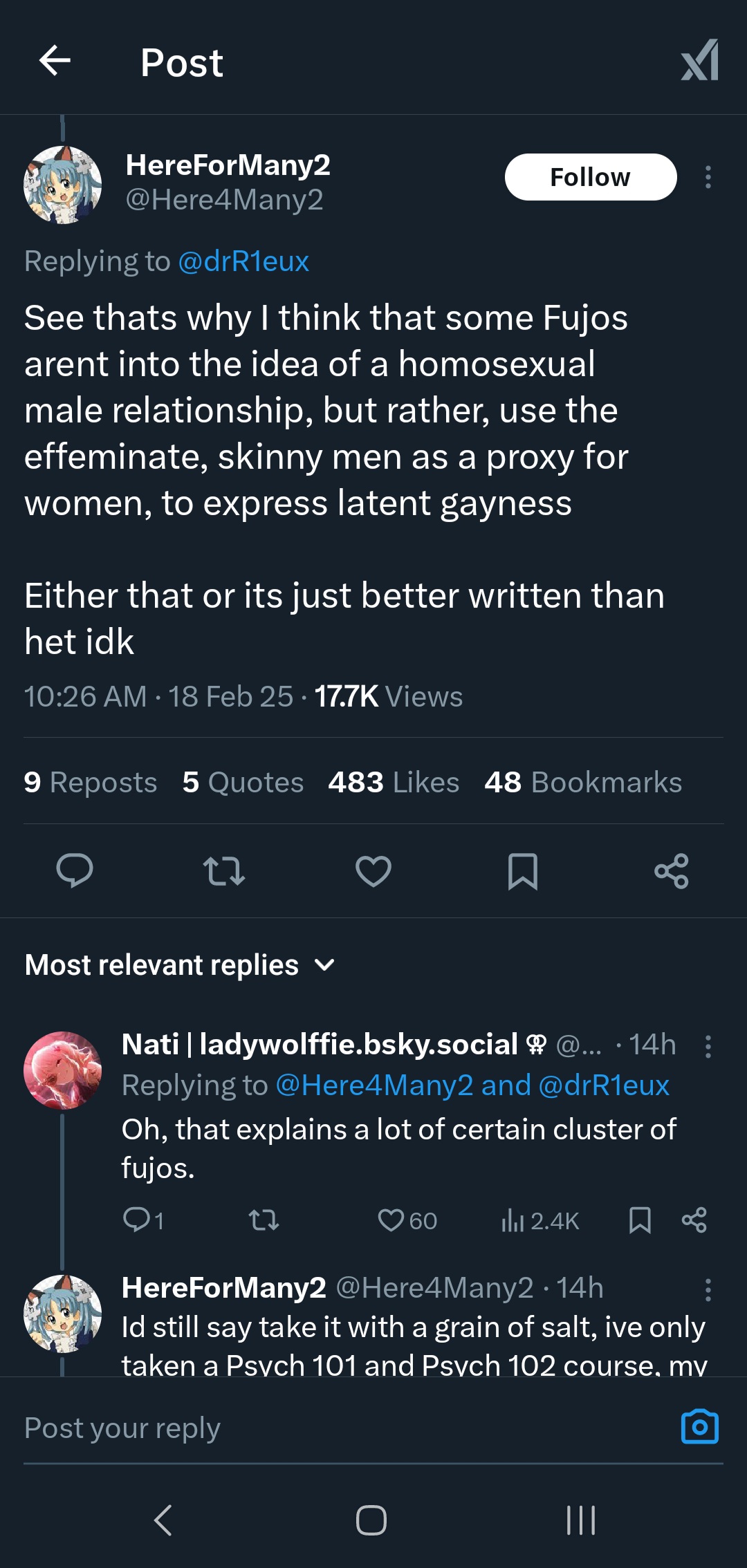 >>8743https://x.com/mcdowell_d14586/status/1925686867300589840One of the replies is a LADS/Nikki fan crying about translations and hoping for them to get reported. Replies full of people crying about straight shippers being oppressed. This is the shit we have to see from gacha "feminists".