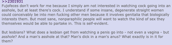 >>8669Women enjoying their sexuality outside of what society approves of has caused seethe throughout history, but enjoying two men fucking causes the most seethe because it filters both straight men and female hetfags, i.e the majority of people. Women get shit for being horny, but they also get shit for not being available to/wanting to have sex with men.