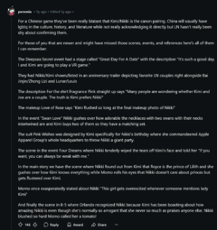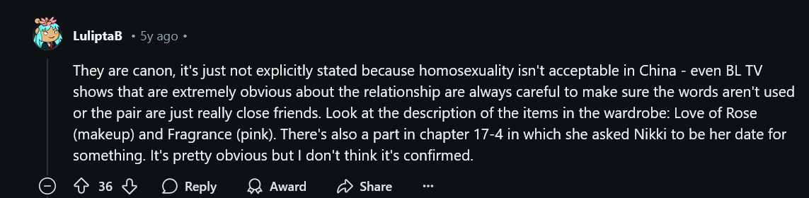 >>6289>never played shining nikkiAYRT and I'll admit I've never played Shining Nikki either. The Love Nikki community got really weird and infested with TIMs, so I sort of lost interest in the games after playing the first one for a few years. There was a strange attitude they often had where they would say Nikki x Kimi was 100% canon. Not in a joking way, but in the way that they legitimately thought it had been confirmed and suggesting otherwise was factually inaccurate. The subreddit was especially bad; I distinctly remember two users getting into an argument about if it was homophobic to deny they're in love or something like that (I don't remember- this was like 5 years ago, but I could probably find it again). I didn't mind the ship and even understood the appeal, but the attitude kind of confused me because fujos are constantly told we're being delusional for looking at similar hints for our preferred pairings.