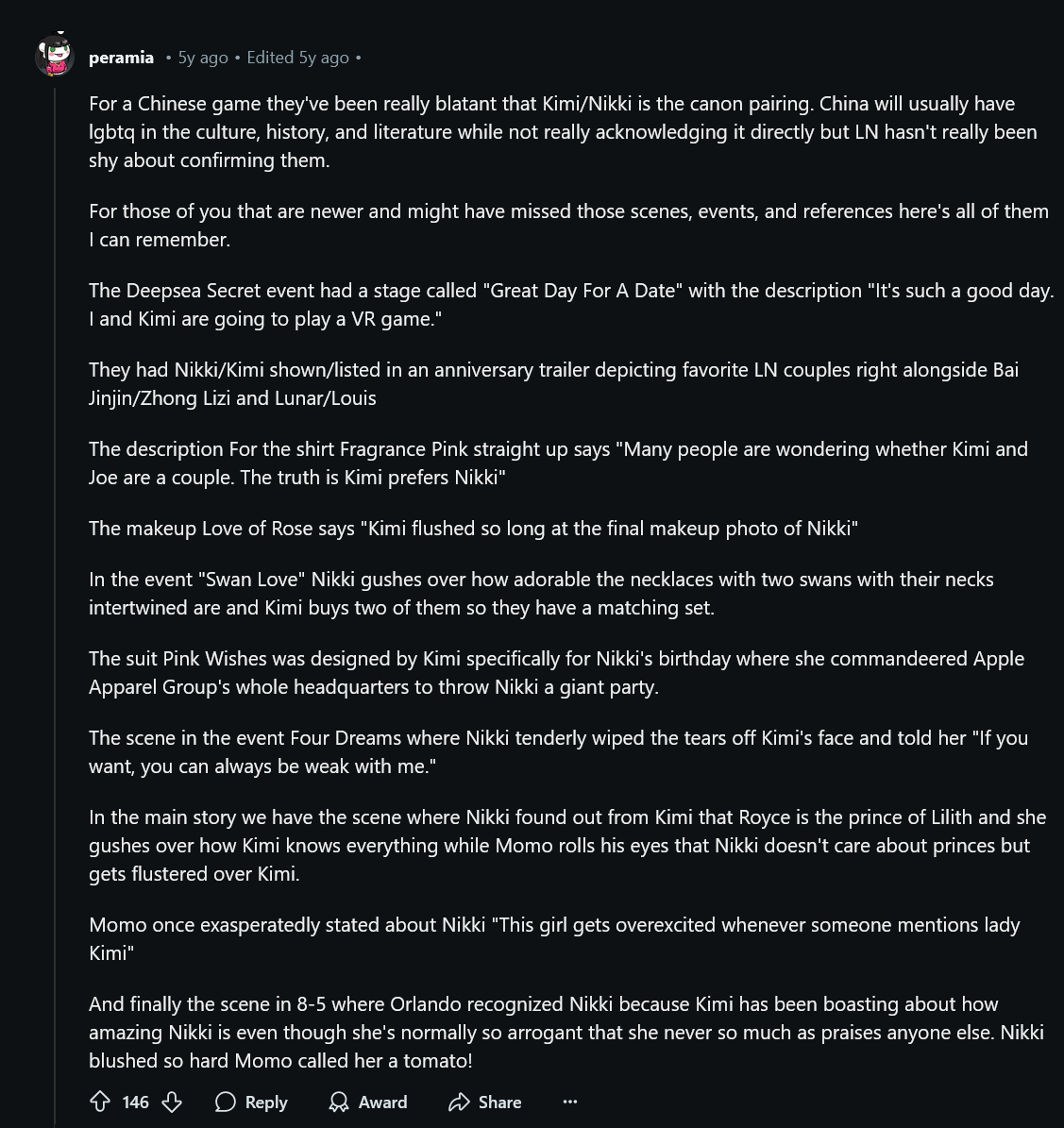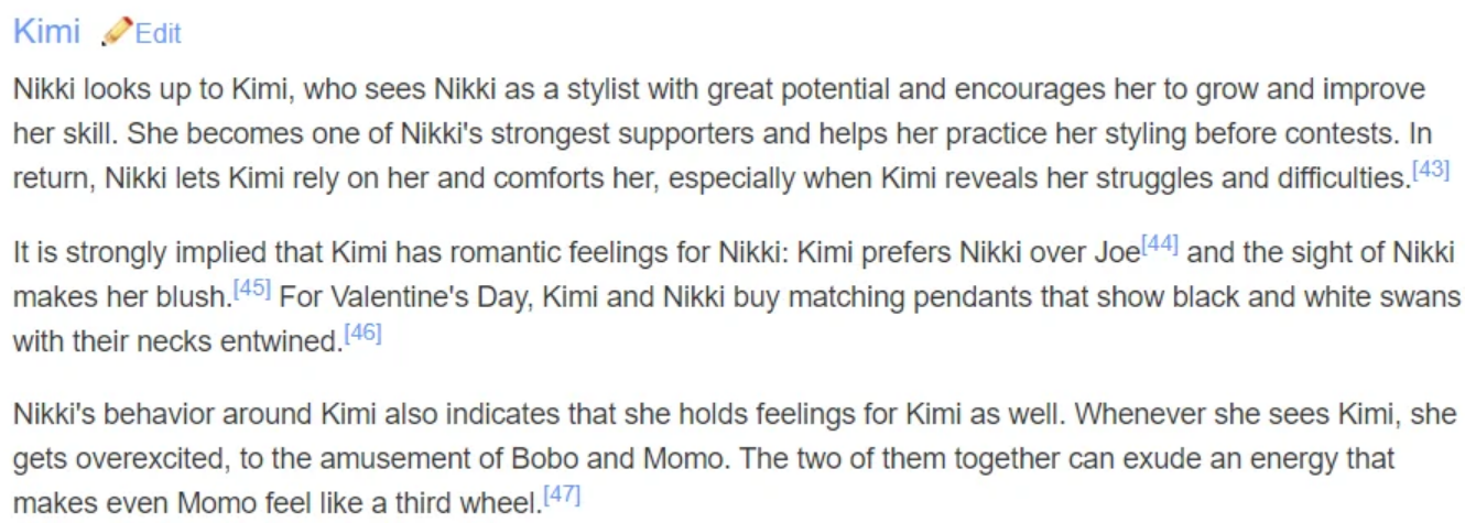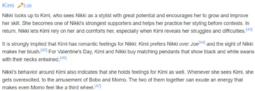 >>6300>even if you're a hardcore nikkimi shipper you have to be retarded to pretend like Nikki games are Yuri games when they have canon het shipsThe subreddit was especially insistent that they were THE canon pairing. And, like, I get it. I have ships where I feel it's very obvious two characters are meant to be together despite what canon says, but there was a certain attitude that developed that was really… strange. Like they'd never had to ship something that had bait and no canonical confirmation, so they didn't know how to react to it not being explicitly confirmed. I even included a screenshot of the Wiki because it perfectly encapsulates what I'm describing kek.