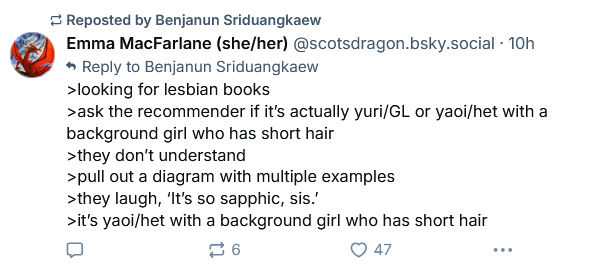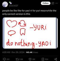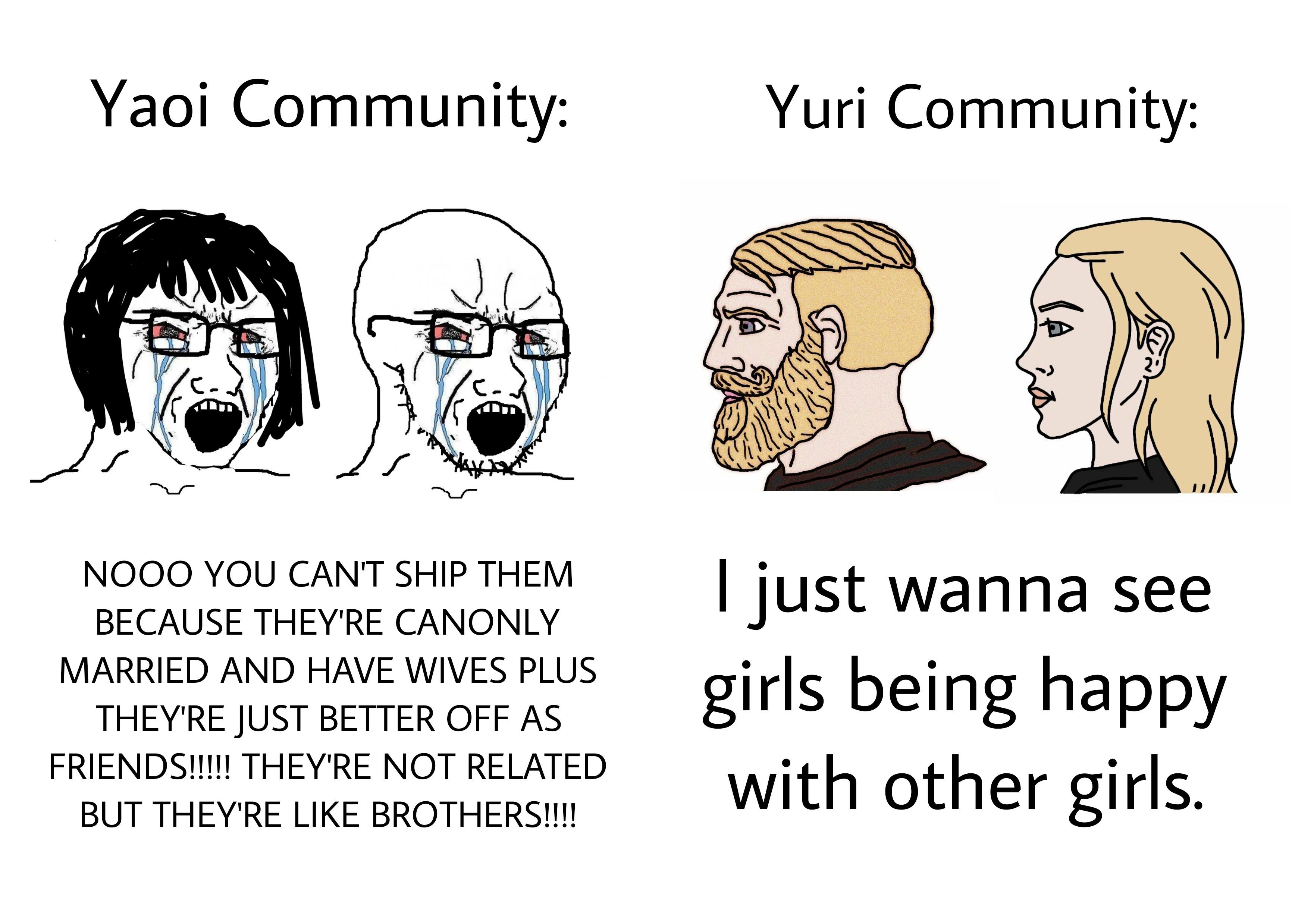 It's pretty telling that the loudest whiners usually do have the blandest taste in yuri dynamics so they genuinely don't understand why the bland best friends aren't launching a ton of fanworks just because 'girls kissing!!' (Unironically, 'transbians' are just selfinserting and don't understand that most actual women need more than this to get invested. Only MtF I have seen who liked BL was attracted to men.)