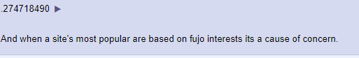 >>8586LOL I recognize this one. A bit off-topic but he made an embarrassingly ranty post about how Hayao Miyazaki is actually a fascist where the conclusion he arrived at was "being into snuff is more sane and normal than enjoying bucolic fantasies". Good to know he is retarded on top of insane.