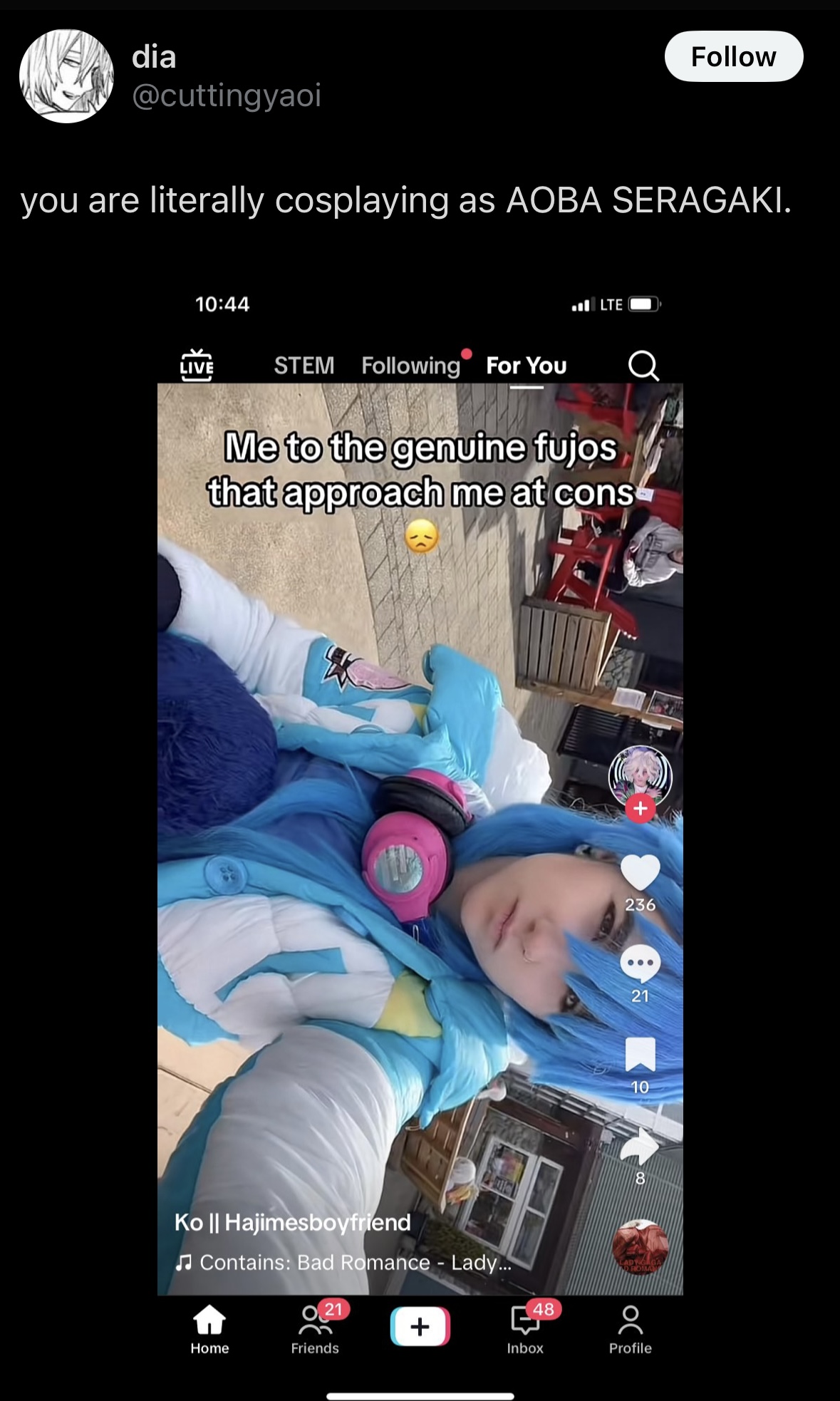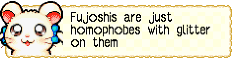 I'm tired of seeing fujos catching random strays being misinterpreted and blamed all the time for stuff we don't do. (like, tell me why I saw shoujo manga fans blaming fujos for the author writing male characters interacting? Fujoshi are not reading straight romance shoujo manga. And also, do you just want the male characters to have no other traits than existing for the female mc? You're no better than a moid then.)