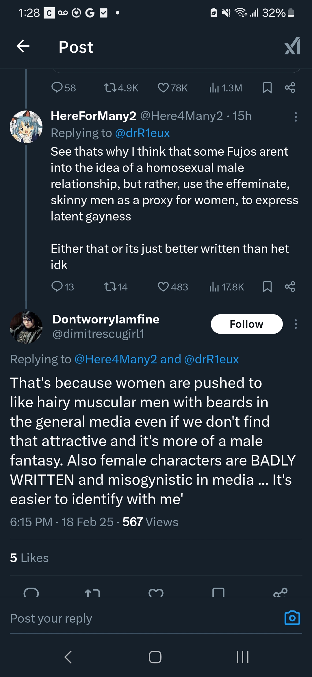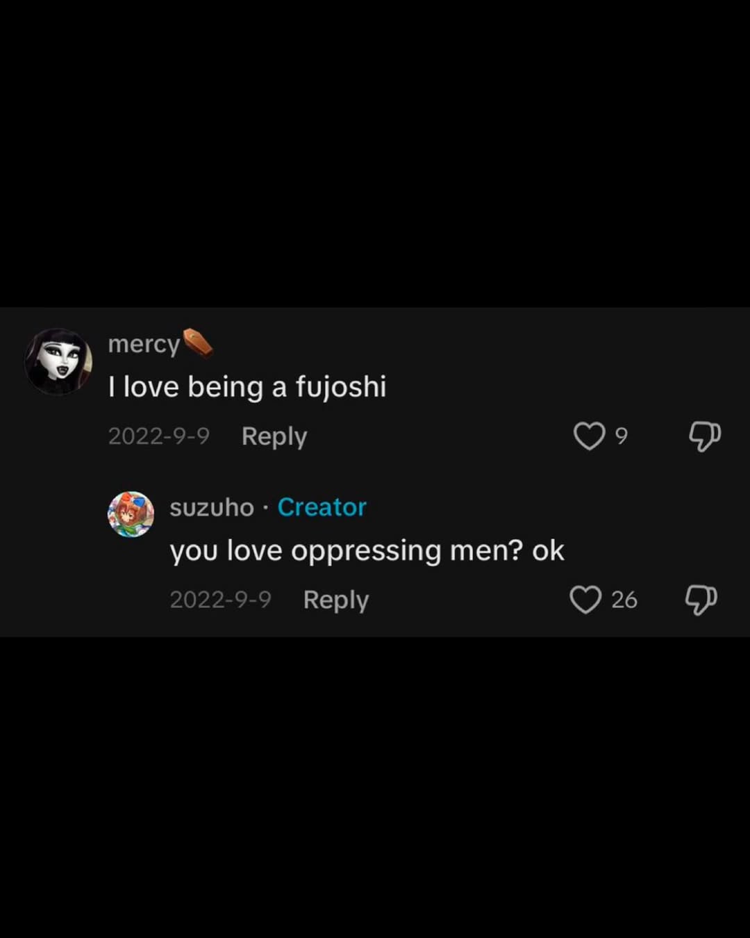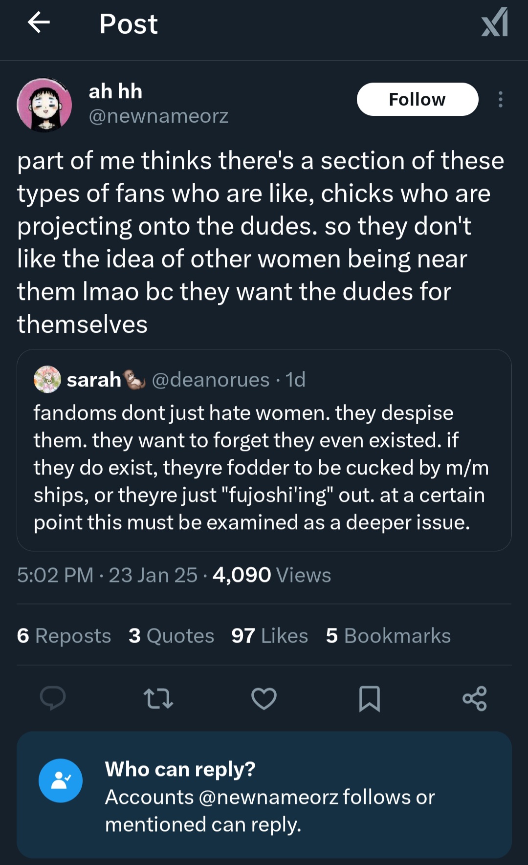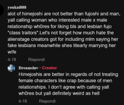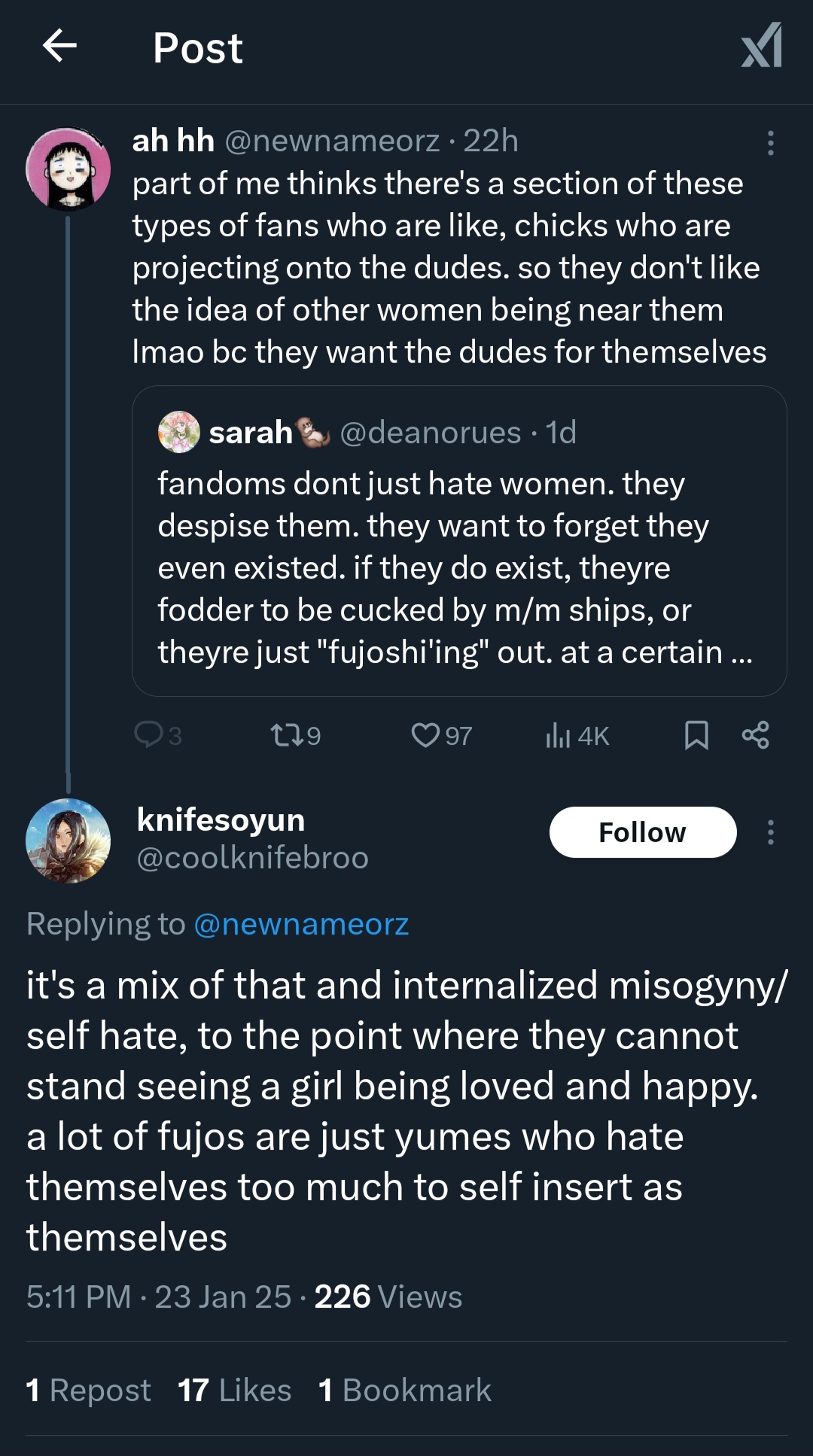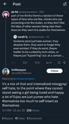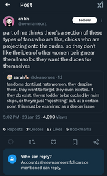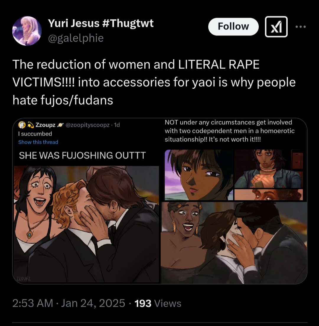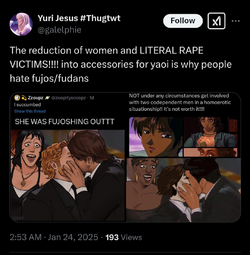 >but yumesTheir fantasies are about themselves being worshipped by some cookie cutter bishounen, but with fujos I think it's hate towards women being attracted to men imo.