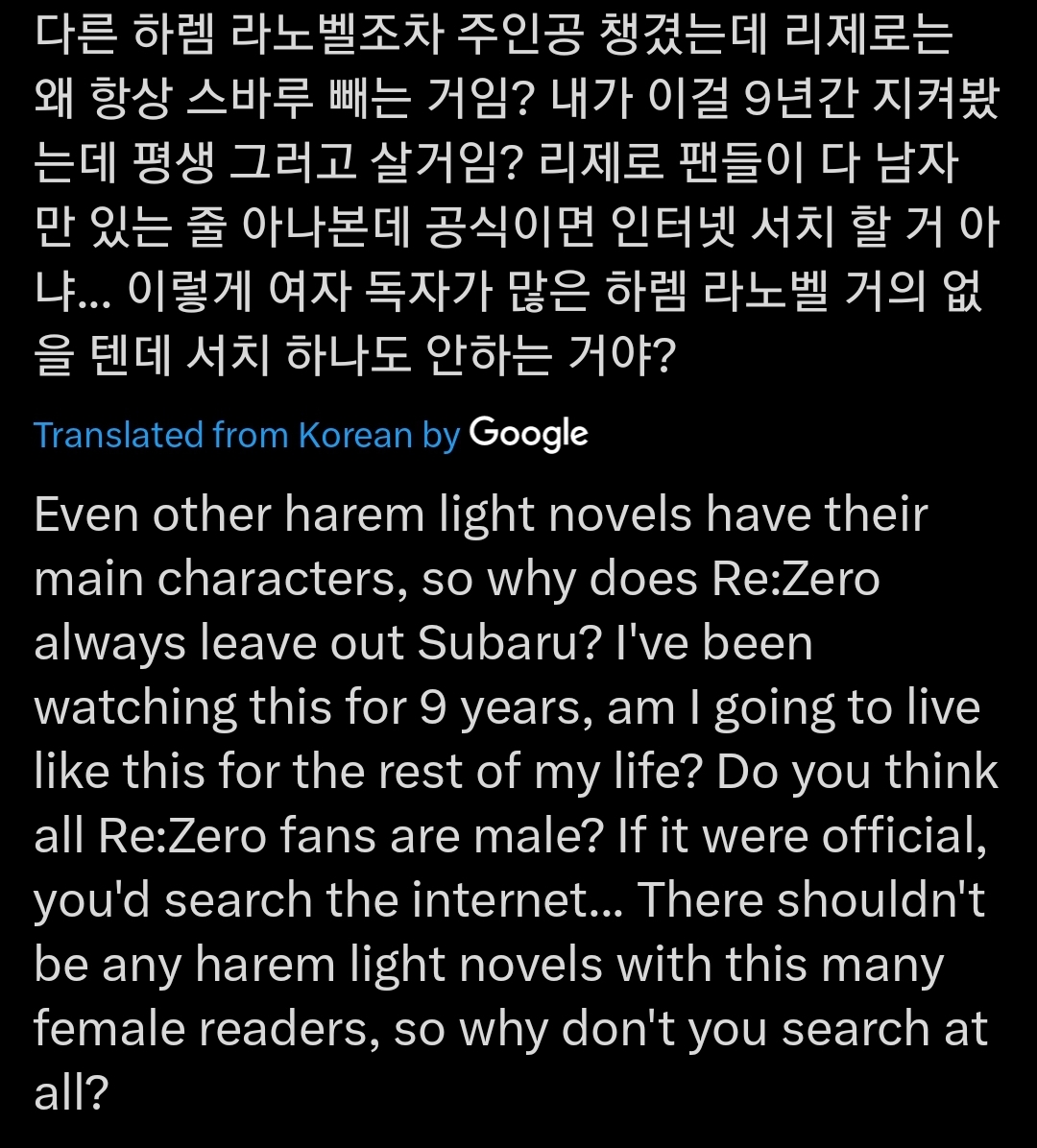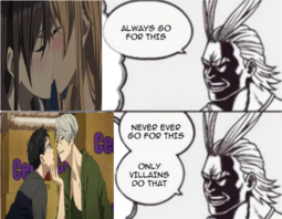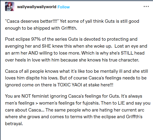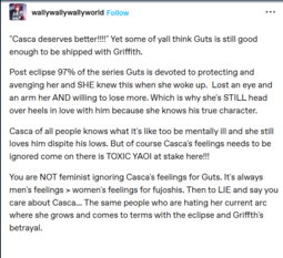 Also if they if they have more food in anime and gacha games where all the male characters are phased out for incels, then why are they whining about not enough fanfic? Most fanfic is for non canon ships because there's not much canon BL in anything because it's more risky. No shit there's less fanfics for ships that are already canon, what story is there to tell about high school girls having their first crush when the anime already showed that?