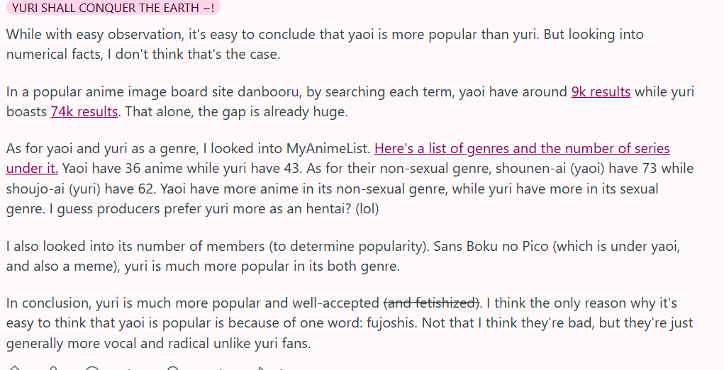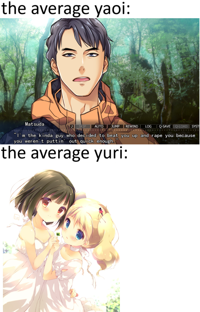 >>8611 said, male-created yuri tends to be more waifu focused (just search yuri on Pixiv and you'll find two waifus sucking the same mob dick and other stuff that's barely 'yuri')
