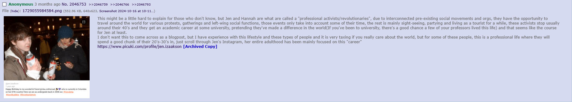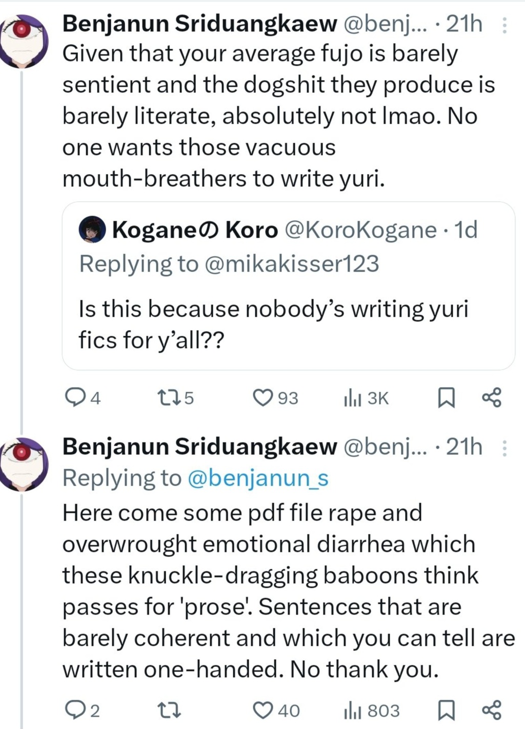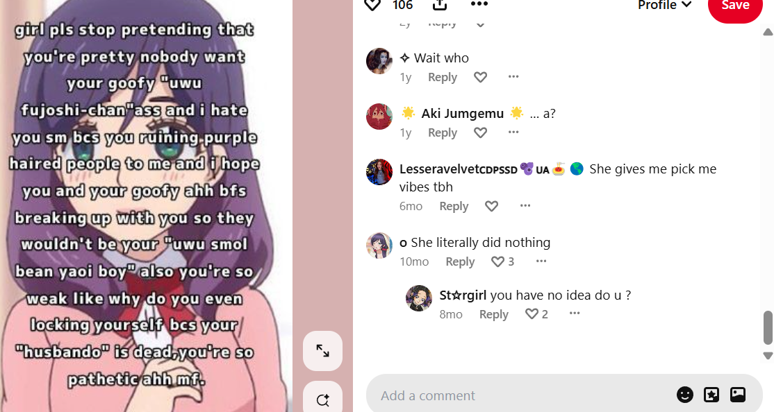 >>8619>>8620Do they not realize maybe they get less "content" because they bully the shit out of yuri artists if they dare draw for other ships like bl or het? I never see fujos harass artists for drawing het or yuri but these himejoshis chase out any yuri artist as a traitor if she dares branch out and like other ships. Not to mention how there's much more antis who harass each other over age gaps in himejoshi circles on twitter.