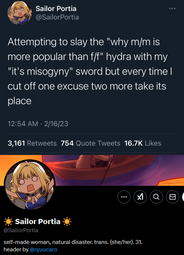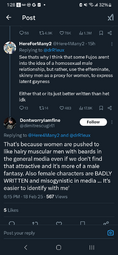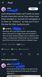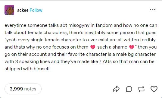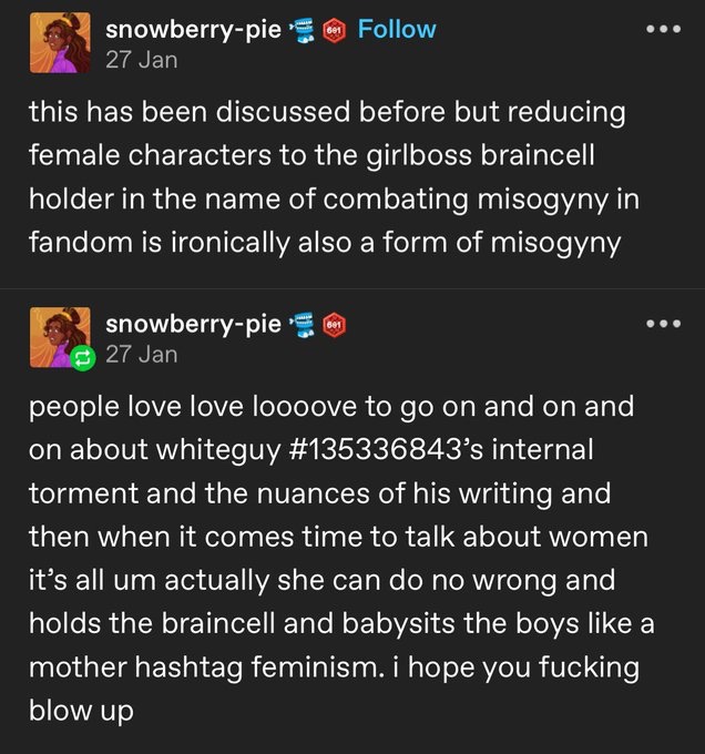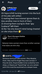 >>8672>straight yumes would get more or equal shit if that was the caseThis does happen, just look at the butthurt over male characters existing in omnipandering gacha and male hate towards the latest popular husbando. So women get hate for being into the wrong kind of men because it's 'cringe' or doesn't fit their image of what they want women to like, or for existing in a fanbase because the male fanbase resents them getting any attention.