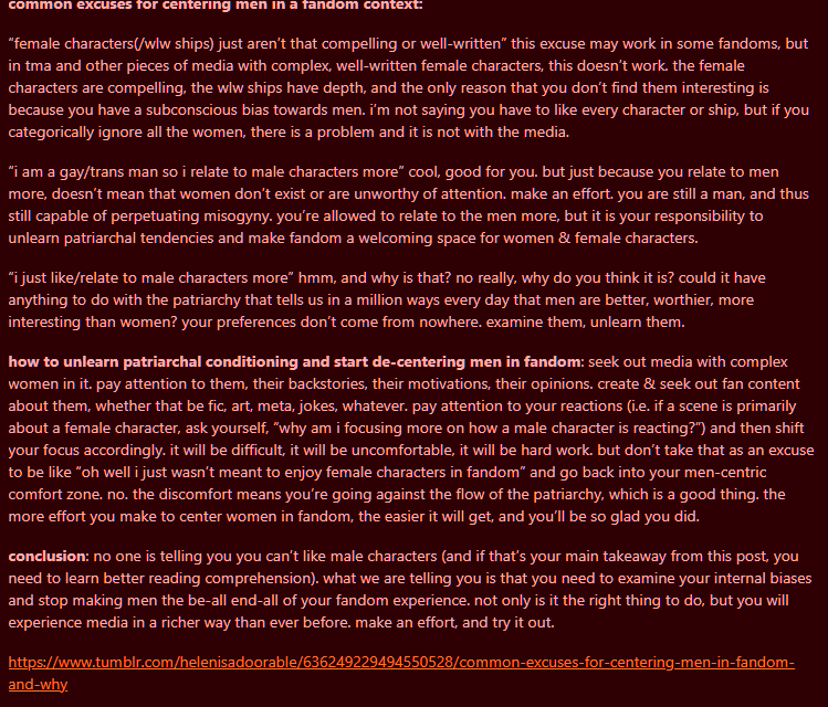 also it's due to men demanding that everything panders to them and feeling butthurt that their media isn't centered only around their own desires. i don't think people give shit to women for being straight specifically, not any more than women who are bisexual or lesbian get shit on. it's just a general trend of wanting to control women's sexuality no matter its swing because it makes men insecure