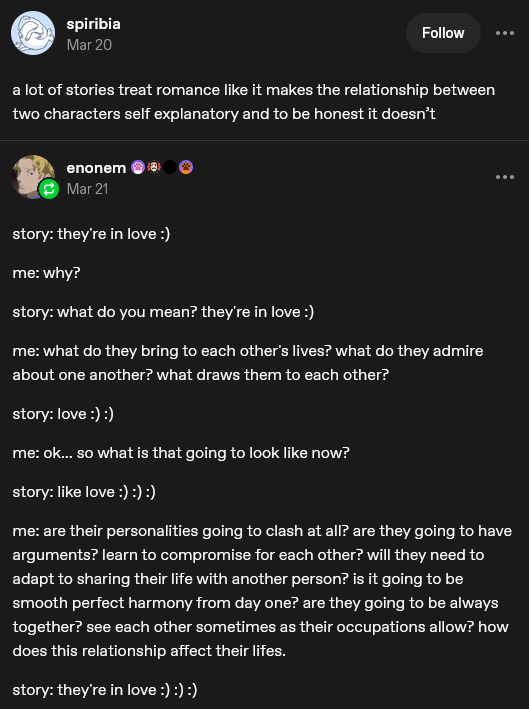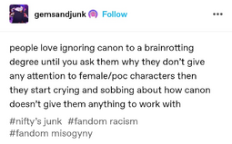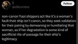 They can’t stand fans who enjoy anything outside of muh canon, but the moment canon doesn’t align with their tastes they twist it and make it a personal battle to confirm the canonicity of their ship.