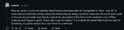 Also, I swear these people have never played shining nikki because in that game I'm 95% sure that the devs were trying to ship Nikki with a male named Loen. The game events usually feature straight couples in the story, but the event outfits are made into female clothes because Nikki's a girl they have no male model, there's like no yuri.